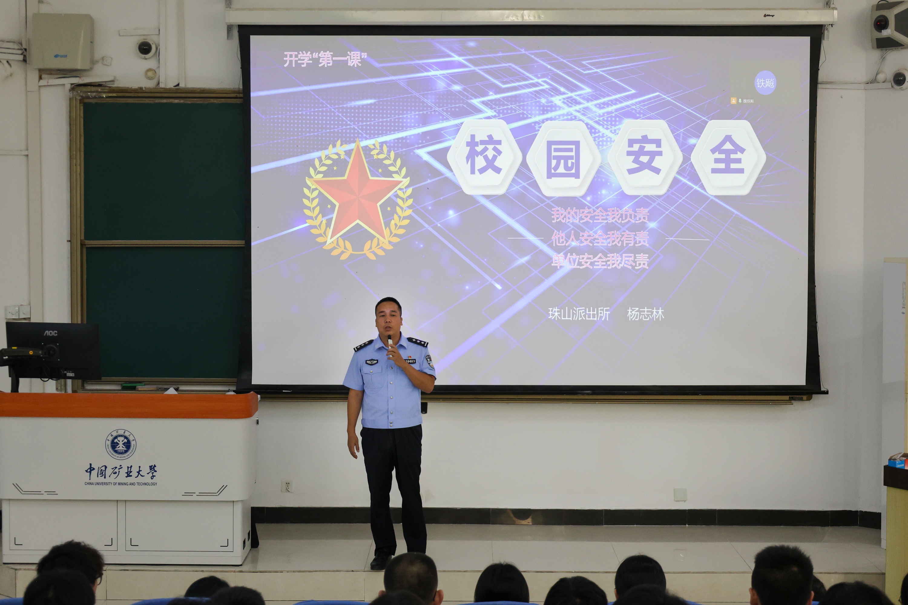 为切实提升2025级新生的安全防范意识与应急处理能力,筑牢校园安全防线,助力其顺利适应大学学习生活,9月1日上午,立足“开学第一课”重要契机,学院于博学楼2号楼C102教室举行校园安全专题讲座,特邀珠山派出所警官杨志林作为主讲嘉宾。学工办主任刘世通、2025级专职辅导员魏铁飚以及2025级全体本科新生、研究生线上线下共同参加。