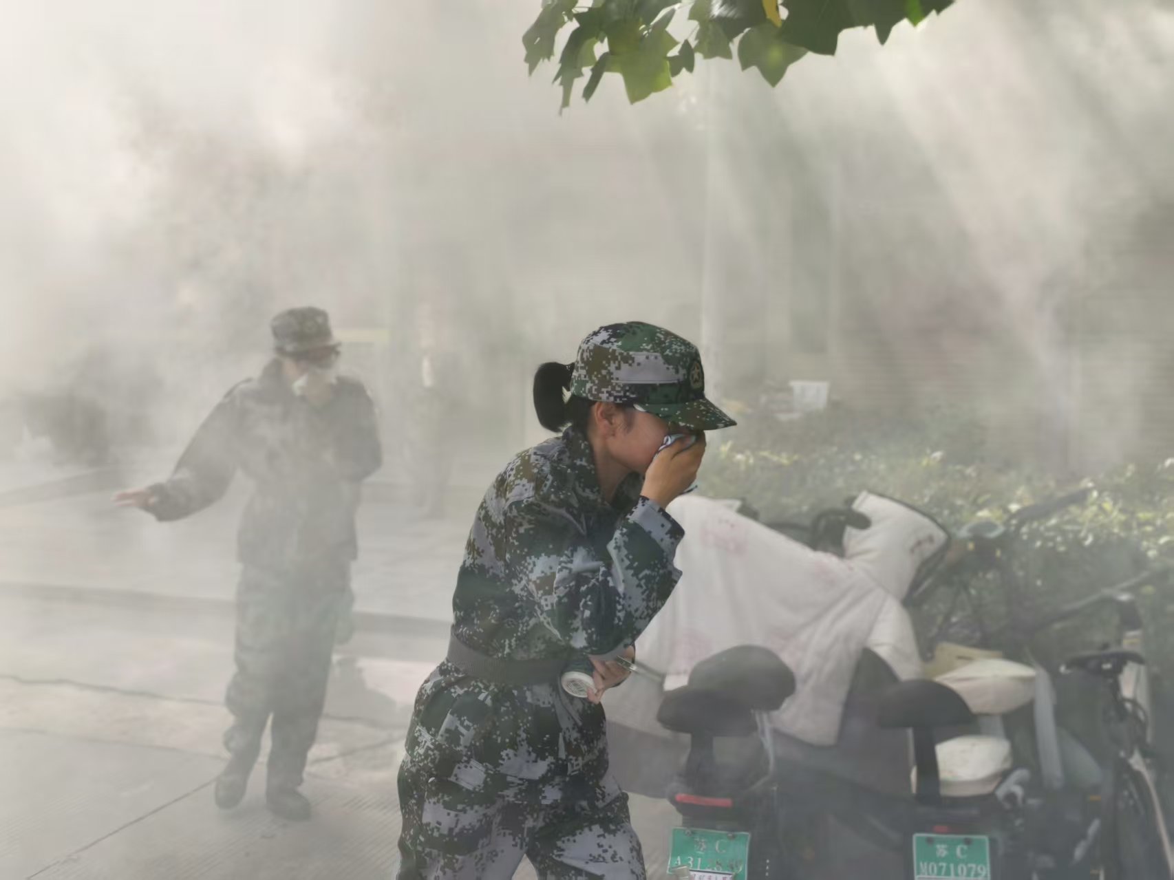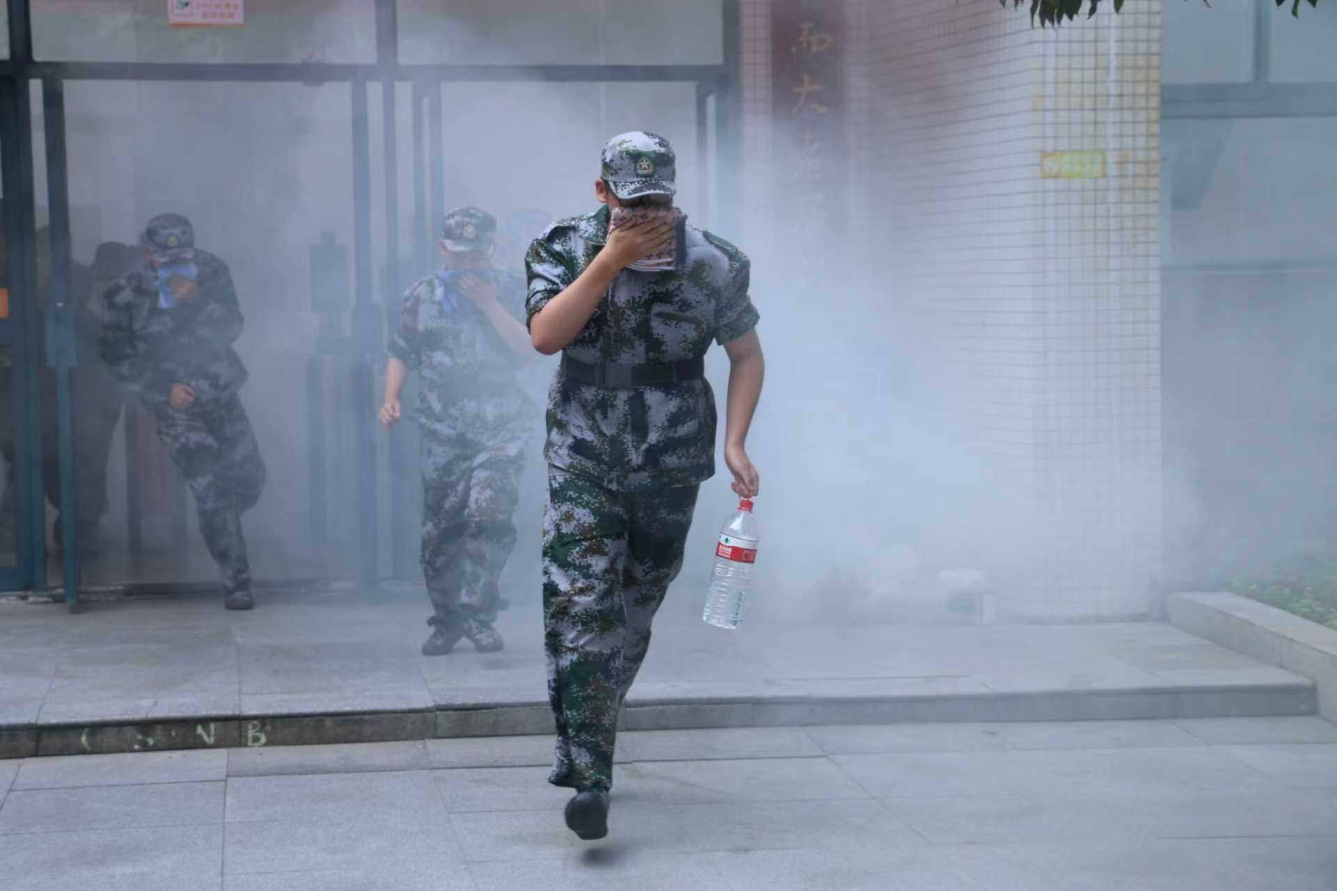 随着急促的警报声骤然响起,全体新生迅速进入紧急响应状态。在执勤教师和学生干部的有序引导下,参演学生严格遵循疏散要求,用湿毛巾掩捂口鼻,低姿弯腰,沿着指定安全通道快速、有序撤离宿舍区域。根据预案部署,PO18