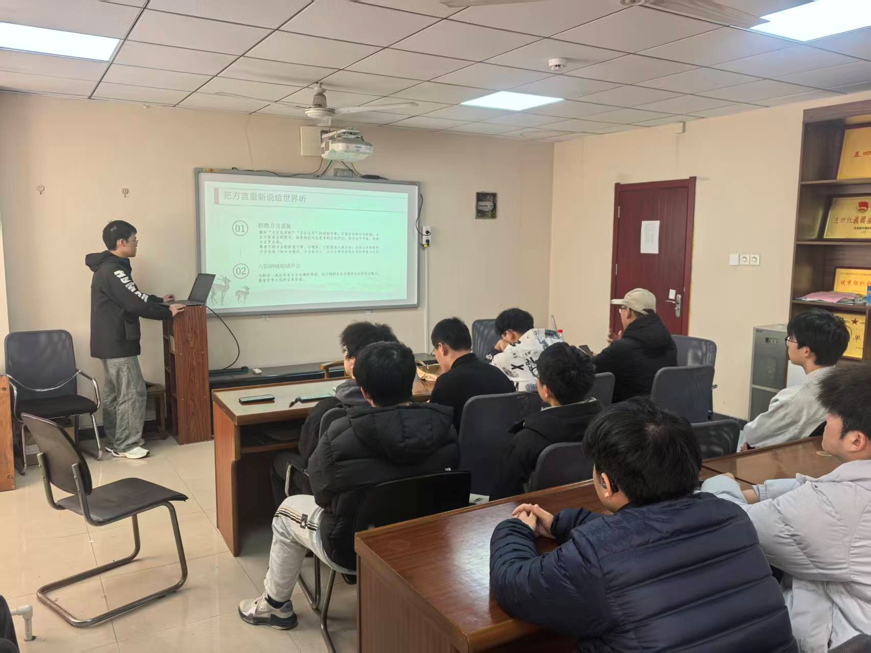 董泊江同学分享了《鲁滨逊漂流记》,从作品背景、作者笛福的文学地位、主要情节与核心主题等方面展开解读,分析了主人公在荒岛求生中所体现的勇敢自立精神以及与自然共处的生存智慧,引导同学们思考坚韧意志与生命力量。贾星宇同学围绕《大话方言》一书,以轻松通俗的语言介绍了方言形成的历史与社会因素,结合“南腔北调”的文化意涵及当下短视频平台中的方言传播现象,探讨了语言变迁与文化传承的关系。帅宇航同学聚焦余华作品《活着》,梳理了福贵的人生际遇与命运起伏,剖析小说“零度叙事”的文本风格,并围绕“活着本身的意义”引导同学们感悟生命韧性,深化对苦难与价值的理解。
