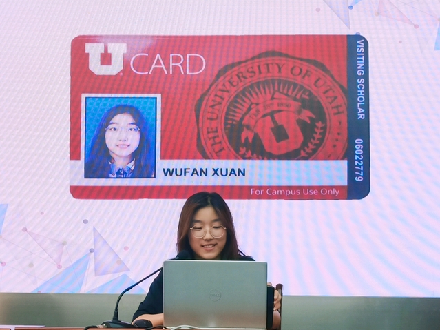 轩吴凡同学也向大家分享了自己在美国犹他大学的访学经历。她将自己的出国经历浓缩为5个关键词:自信、积极主动、享受生活、实力见真章、把握时间。她通过亲身经历向大家解释了这五点对于成功来说有多么重要,并鼓励大家为自己的未来而奋斗,积极主动去了解本学科未来发展的前景。