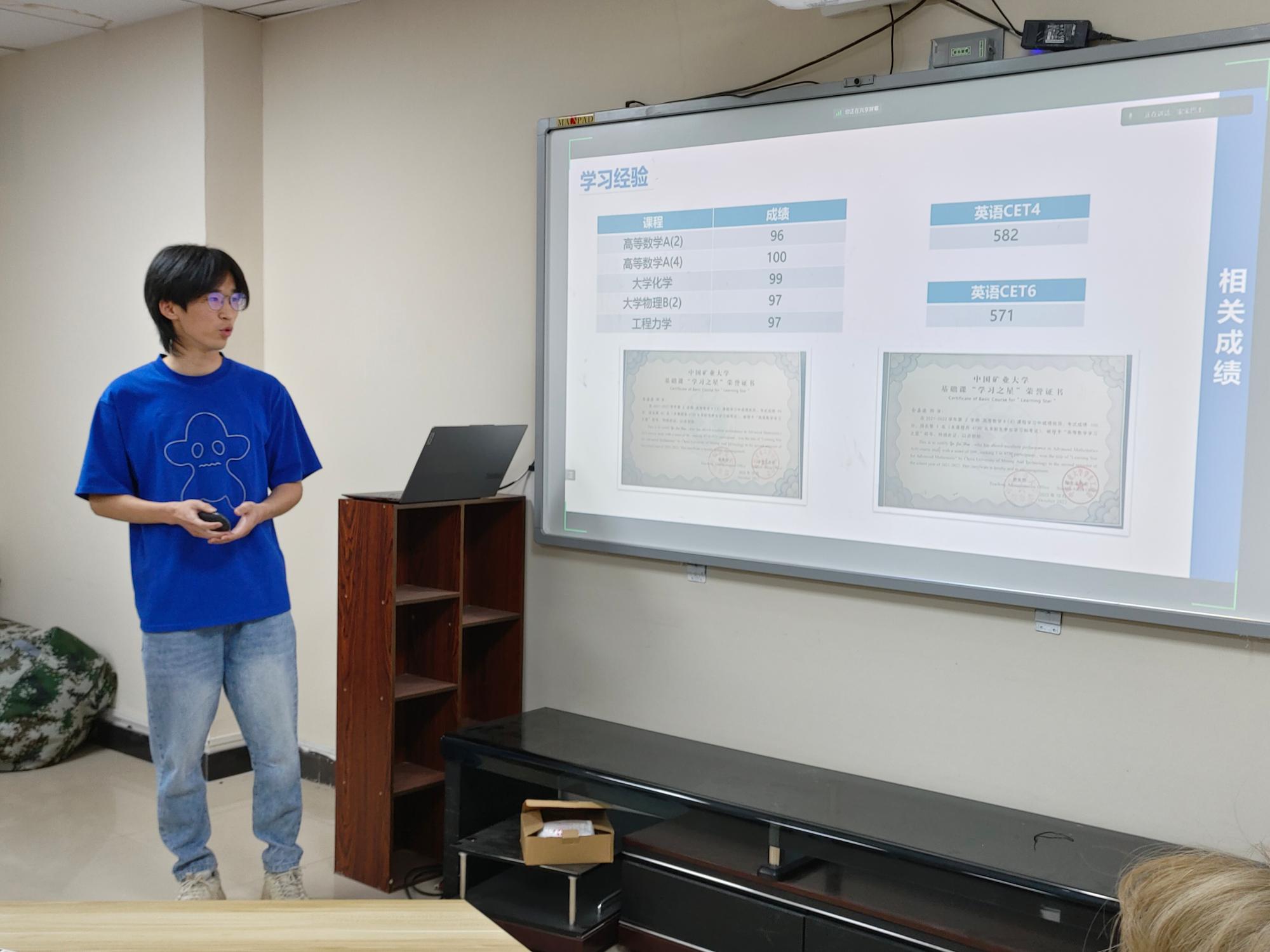活动伊始,俞嘉濠以“以力胜智,勇攀高峰”为主题,结合实际经验,向同学们讲述自身的发展经历。在学习经验方面,俞嘉濠在专注集中的课堂学习、深入理解的课后复习、准确高效的题目训练等三个方面向同学们提出具体的实践方法,并展示相应的学习成果。俞嘉濠从学生工作角度出发,阐述了自身的履职经历,鼓励同学们积极参与学生工作,提升综合能力。在科创竞赛方面,俞嘉濠在个人和团队竞赛两个方面展示了丰硕的参赛成果,并通过鞭辟入里的分析向同学们展示了科研竞赛的独特价值。最后,在生活经历方面,俞嘉濠展示了自身在运动、动漫、手工、吉他、摄影等多方面的心得体会。接着,秦东子聚焦于班级建设展开详细剖析,向同学们介绍了PO18