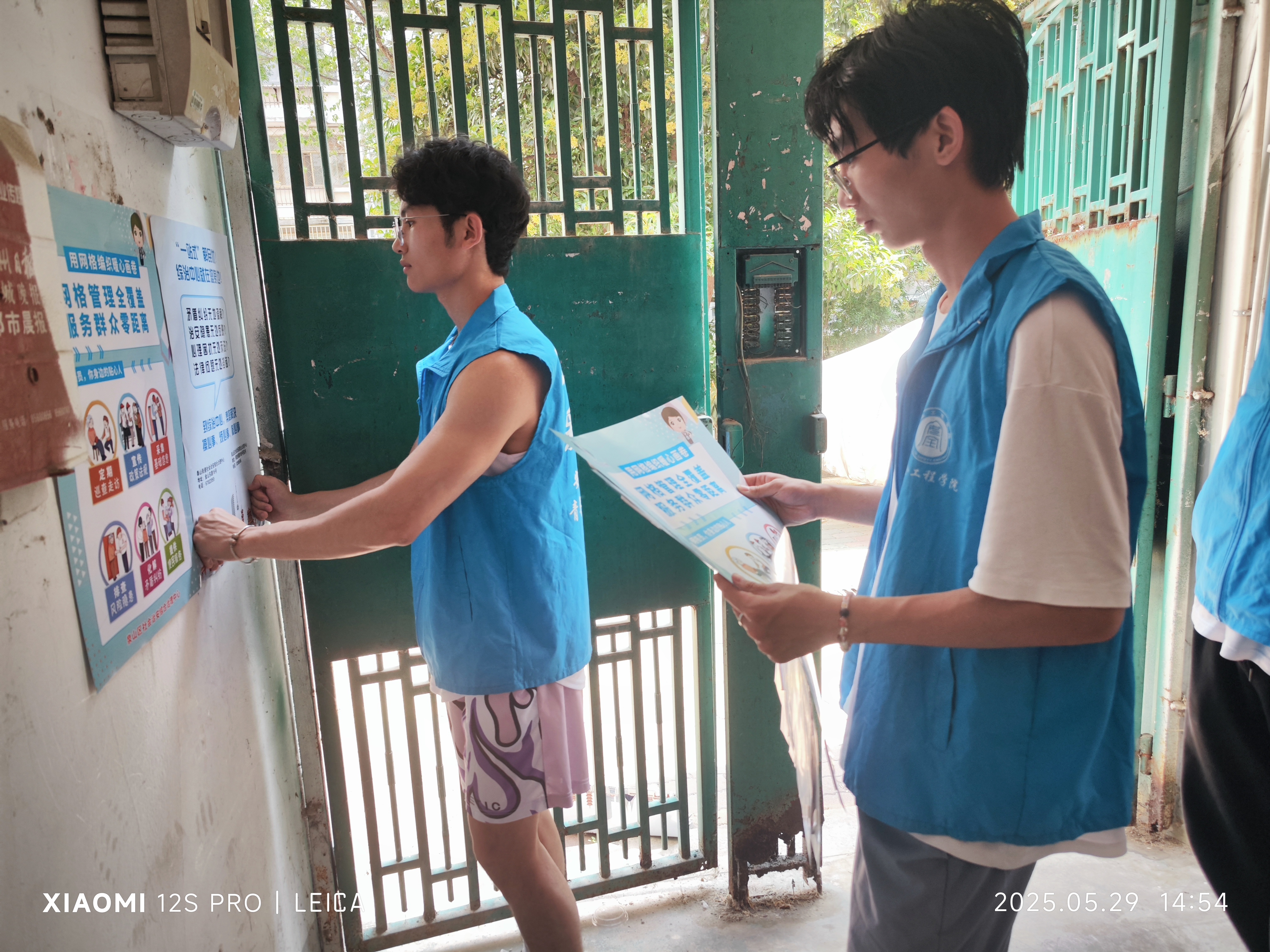 志愿服务部的学生志愿者们走进风华园社区,与社区党群服务中心携手开展“网格员精准帮助每一位住户”主题海报张贴宣传活动。