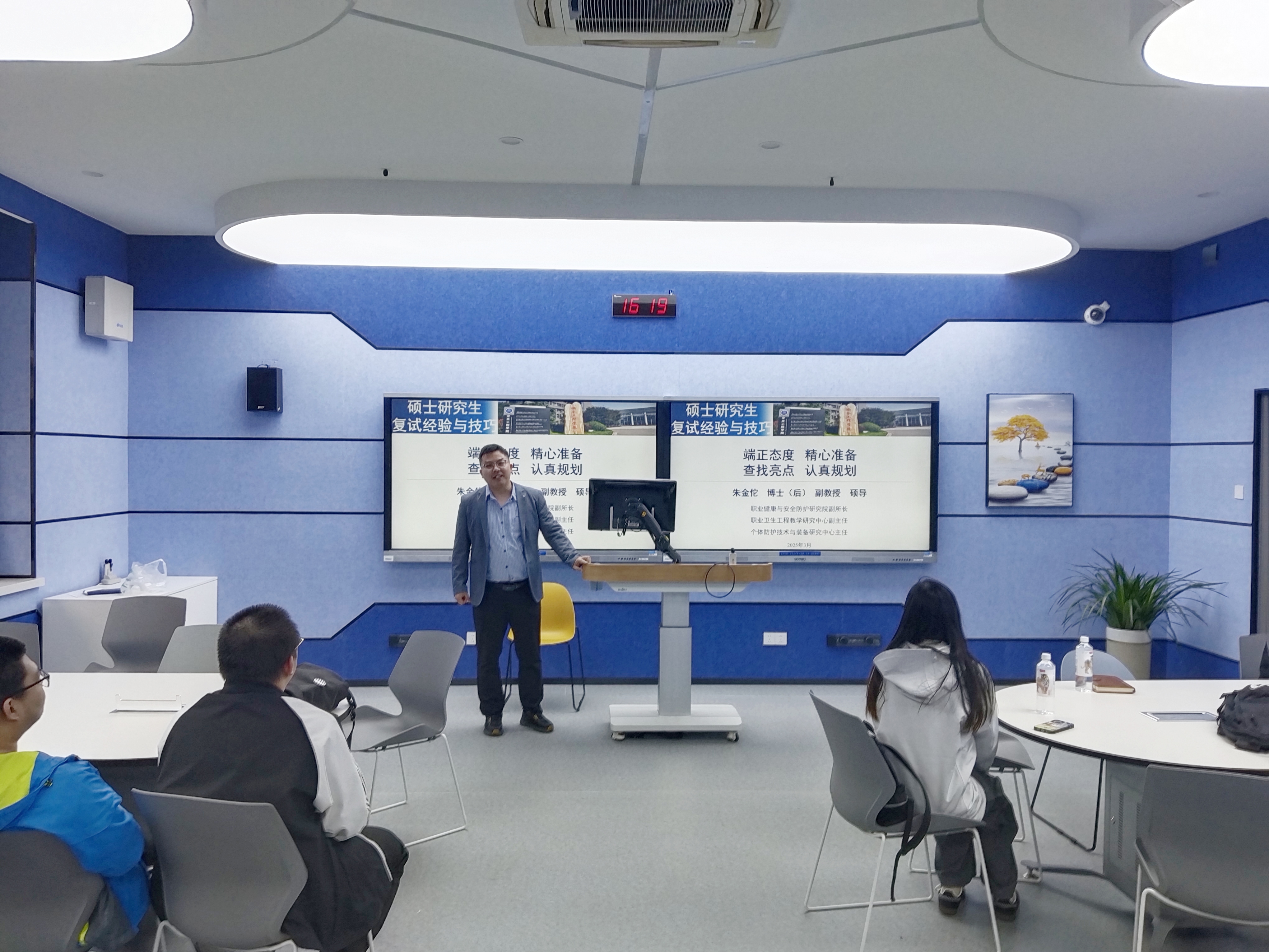 于博五A106召开2025届毕业生考研复试、调剂指导专题讲座,朱金佗老师和胥振老师受邀主讲,学工办主任、2021级辅导员刘世通主持。