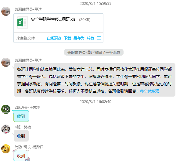 安全学院召开全体专兼职辅导员视频会议,传达学校会议精神和工作要求,组建了“院领导+辅导员+骨干”的“三位一体”防控队伍,以班级防控为重点,夯实网格化管理,推动关口前移、触角延伸、重心下沉,真正实现疫情防控网格化。会议决定开展学生需求的调研,加强对学生的信息反馈,解决学生的困难。