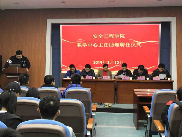 教学中心于矿业科学中心A200举行了教学中心主任助理聘任仪式。安全学院副院长王亮、教务科科长张伯权、安全专业教学中心副主任时国庆、王凯,消防专业教学中心副主任刘洪永以及安全学院2017级国际班班主任朱金伦出席本次会议。会议由安全学院团委书记刘世通主持,全体教学中心主任助理和部分学生代表出席了本次活动。
