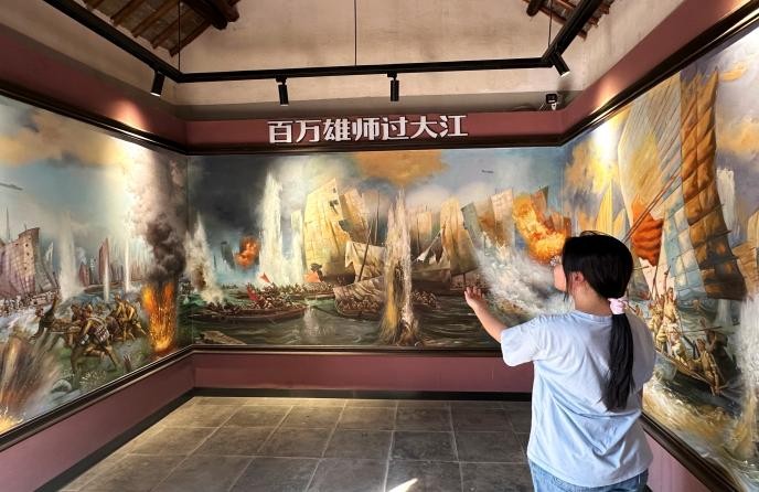 实践团成员们依次参观作战指挥室、史料陈列馆等场所,通过泛黄的电报手稿、锈迹斑斑的枪炮器械、翔实的战役地图等文物,沉浸式重温渡江战役烽火岁月,感悟军民同心、奋勇向前的壮阔历程,坚定传承红色精神的信念。团队穿行于各个展区,“战前形势”“战役实施”展区中的作战地图、“打过长江去,解放全中国”电报手稿、“为人民服务”纹样搪瓷缸、带血的刺刀等文物,无一不诉说当年的激战与坚守;“胜利会师”展区的军民相拥照片,呼应支前的坚毅与胜利的喜悦。实践团成员们感慨道:“渡江战役的硝烟早已散去,但那段历史中凝聚的‘军民同心、奋勇向前’的力量,永远是照亮我们前行的光。”