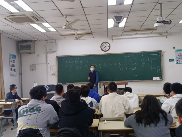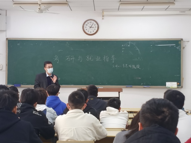 活动伊始,张伯权老师分析了班级同学的学习情况,嘱咐同学们要继续重视课程的学习,提高专业素质能力,丰富自己的知识储备。李忠辉教授以“考研与就业指导”为主题,为面临考研与就业选择的同学们提供了考研相关的最新信息以及就业工作岗位选择和准备等方面的内容。李教授指出,同学们应当立足当下,杜绝空谈,扎根实处,鼓励有意向找工作的同学积极地体验人生,假期可以主动参加实习,丰富人生阅历、扩展交际范围、探索不同可能。最后的问答环节,同学们积极提问,李教授对同学们提出的有关未来工作的困惑进行详细的解答。
