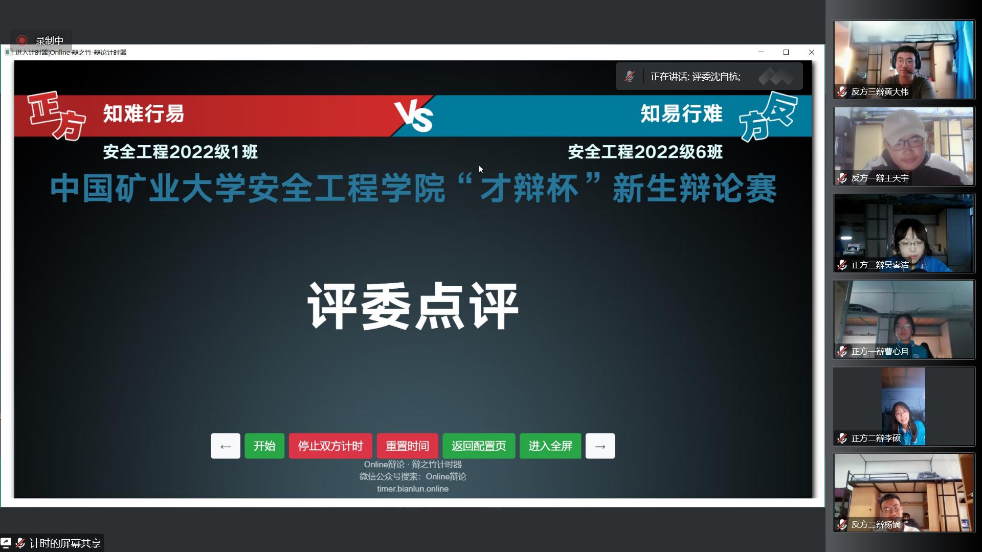 在腾讯会议线上举办“才辩杯”新生辩论赛决赛,辩论双方为安全22-1班和安全22-6班,双方就“知难行易还是知易行难”这一论点展开辩论。安全学院辩论队主席李玥瑶担任本次比赛主持人,曹静伊、王宇浩、沈自杭、费桢、程凡超担任本次比赛评委。