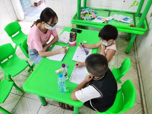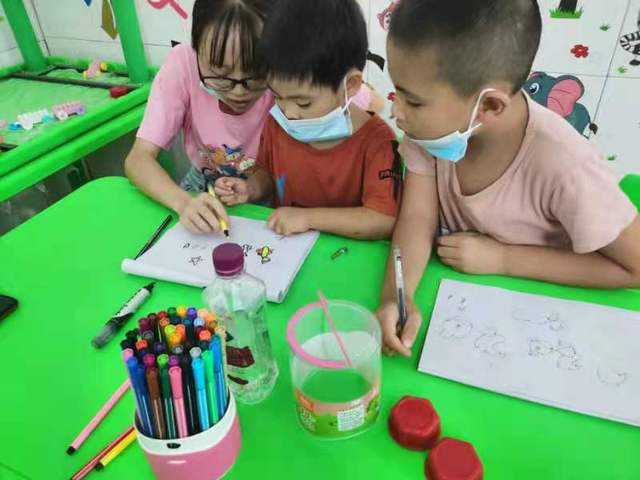 志愿者和孩子们画画