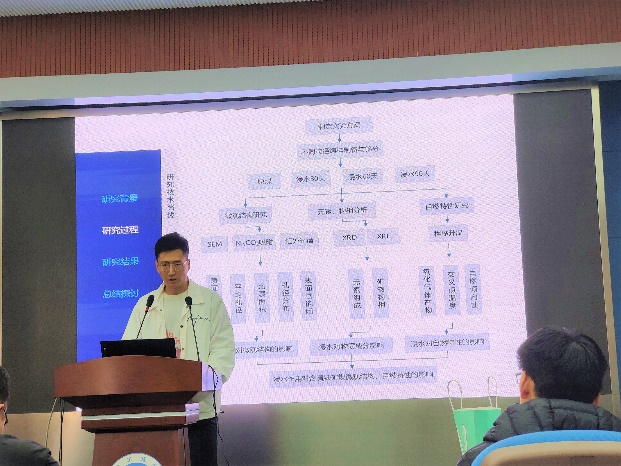 接着,三个学院的优秀学生分别对自己的研究领域、近阶段工作内容做出汇报,以及分享科研、学习生活。首先汇报的是来自安全学院的罗中正同学,他的汇报题目为《浸水作用对含黄铁矿煤样微观形貌及自燃性的影响》。分别从研究背景、研究过程、研究结果以及总结探讨四个方面进行汇报,最后得出以下结论:水水浸后各煤样的表面粗糙度和孔隙发育增加,其中含有黄铁矿的M2煤样的孔隙发育最为突出等。