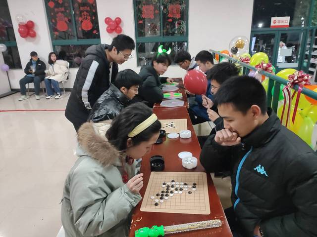 迎新年“游艺宫”活动包括“欢乐套环”、“手忙脚乱”、五子棋等七项游戏及奖券兑换活动这些游戏趣味性十足,既有个人的斗智斗勇也有团队之间的配合,同学们都热情地参与其中,领取了丰厚的奖品,现场一片欢声笑语各个部门的布置别出心裁,一整天的精心布场让夜晚的梅三庭院绚丽多彩,每个细节灌入的是大家迎接新年的喜悦同学们在游玩中缓解了期末复习迎考的压力,展现了同学们活力四射的精神风貌。
