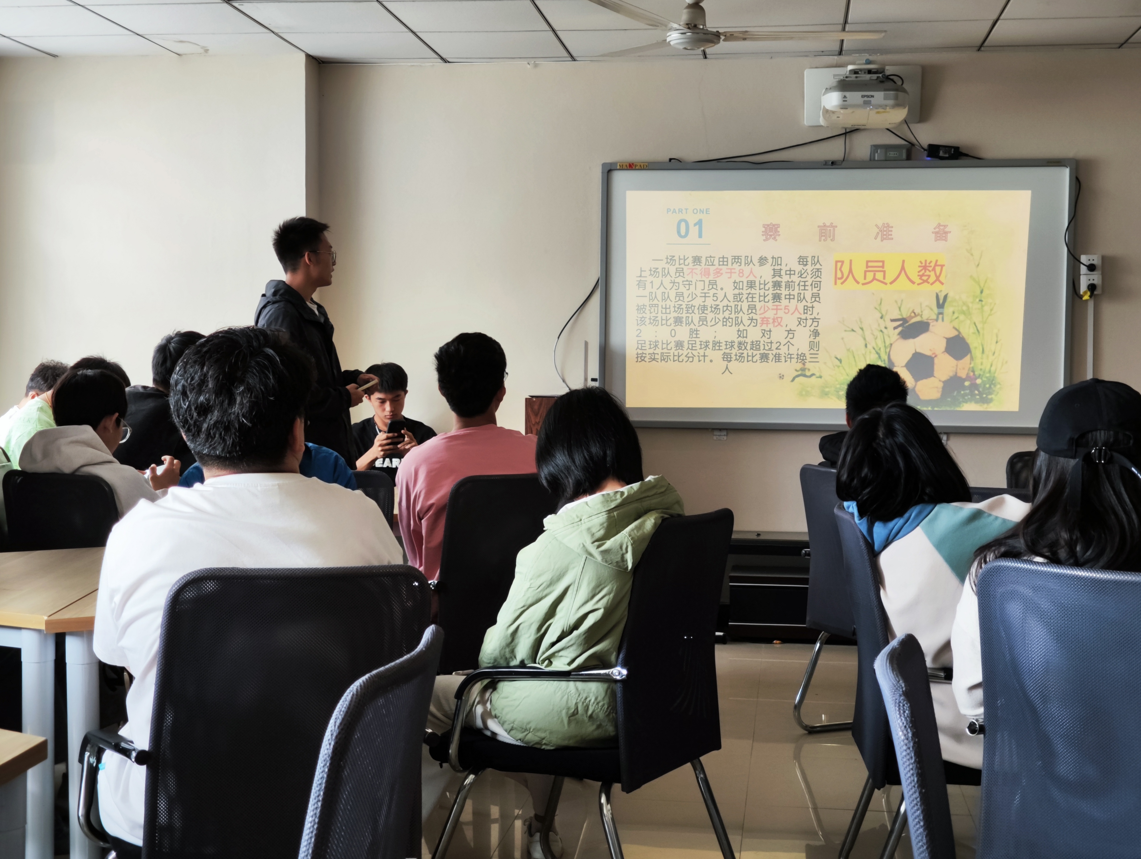 讲座伊始,五位讲解员分别向同学们介绍了篮球、足球、羽毛球、乒乓球和排球比赛的基本规则并科普了该项目比赛过程中的专业名词。在讲解过程中,讲解员不仅亲自示范部分球类运动的动作要领,还播放了运动会比赛的视频带领同学们学习比赛的规则,讲解员从基础规则谈起,由浅入深地讲解了比赛中需要注意的各种事情。通过对不同项目的科普,帮助学生明白球类运动的规则和入门技巧,有利于营造良好的体育氛围。