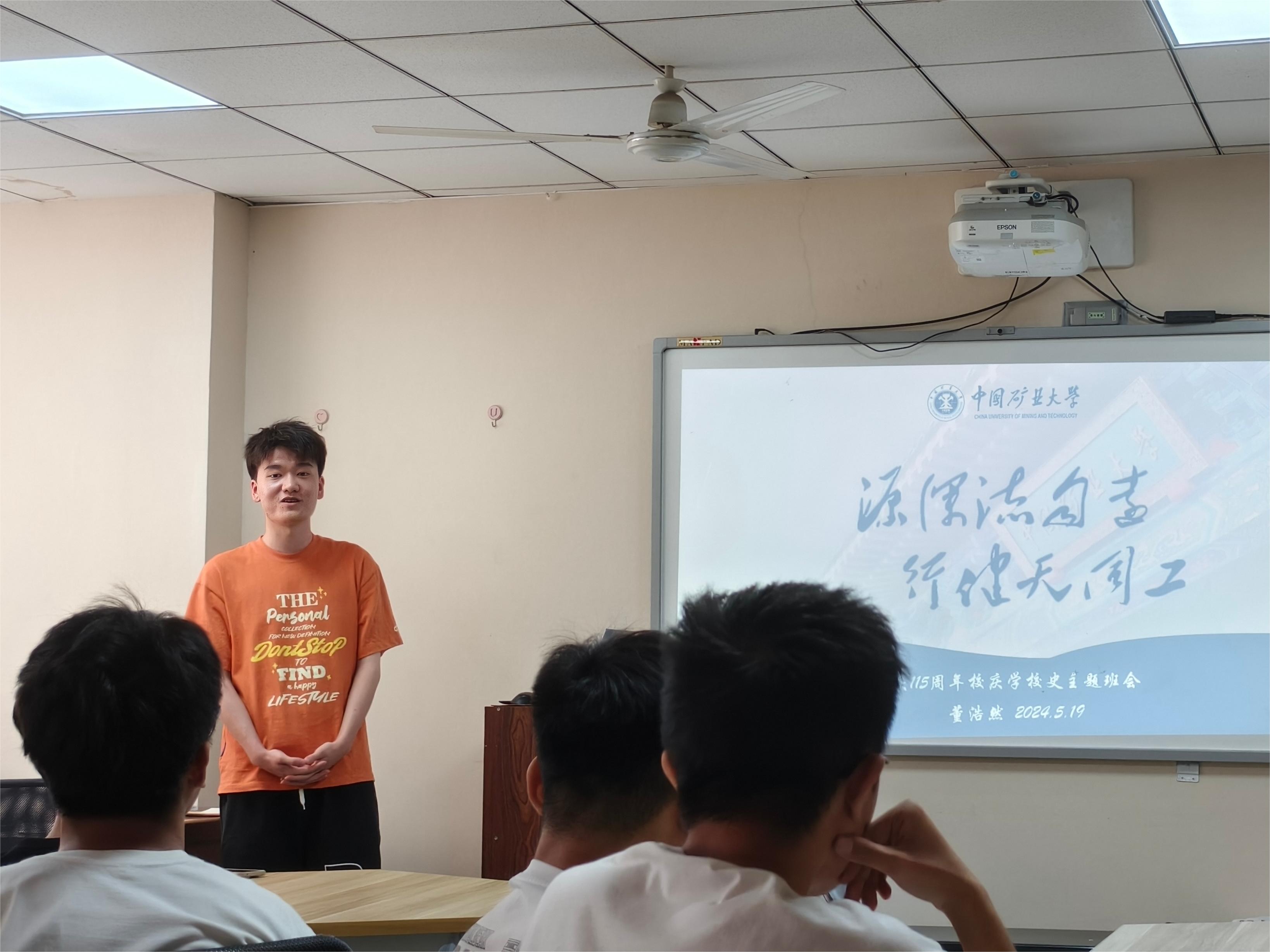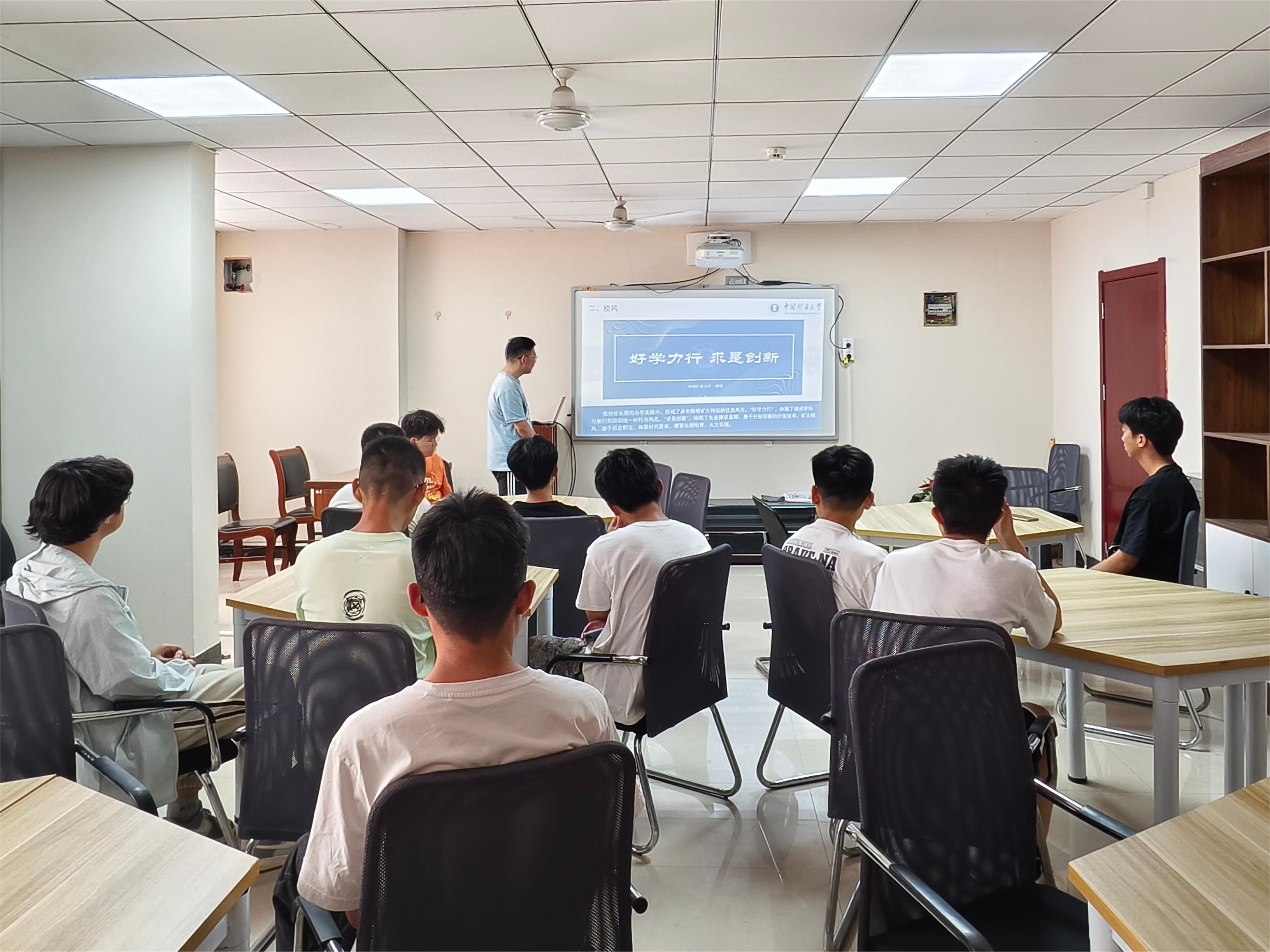 的变迁史与学校不同历史时期的名称变化。接着,董浩然向同学们讲述了“崇德尚学”的校训、“好学力行、求是创新”的校风,“自强不息、艰苦奋斗、追求卓越”的矿大精神的内涵。接着,王彬皓对国际班选拔与培养模式展开介绍,为刚刚专业分完流的同学们答疑解惑。最后,董浩然和王彬皓就同学们提出的关于学业、大创等方面的疑问展开细致解答。