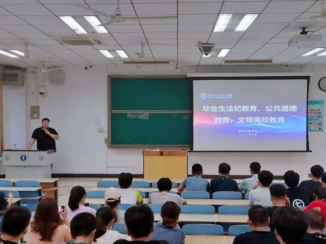 的建设历程及历史成就,增强了同学们的学科自信,提高了荣辱感及归属感,同时促进了师生间的沟通交流。随后,在刘世通老师的组织下一同总结回顾了2017级同学们就业质量高,升学率高等卓越成就,对同学们在校期间的表现给予了肯定。接着,刘世通老师就自己四年来的感悟对毕业生们进行寄语嘱托,“我想大家和我一样怀有感恩的心情,这四年来我们共同成长、改变了许多,希望大家能保持联系、主动沟通、团结互助,将安全学院的家文化传递下去”。接下来,刘世通老师为大家讲解了文明离校的注意事项,注意人身安全、财产安全。最后,刘世通老师叮嘱即将考公、二战研途的同学抓紧时间,认真努力,为即将到来的考试做好准备,同时也向全体2017级学生表达了殷切祝愿。