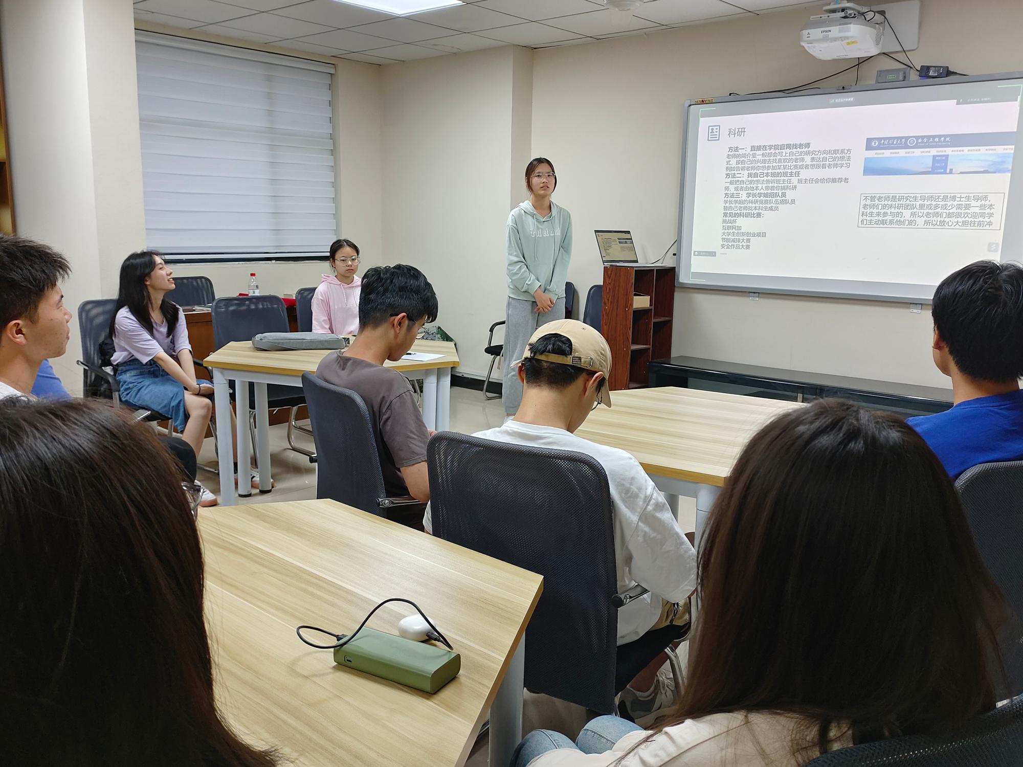 活动伊始,范钰雪从课堂笔记整理、网上课程学习、学习资料归纳和考前复习计划等多方面详细向与会同学讲述了高效的学习方法和有效信息的收集;在学生工作方面,她强调在学有余力的前提下,积极参与学生工作可以提升个人综合能力并拓宽社交范围;在科研竞赛方面,范钰雪向同学们列举了参与竞赛的多种方法以及接触科研的三种基本途径,希望同学们勇于投身科研,努力提升专业能力。接着,叶雨萱以初入大学的迷茫焦虑展开本次的主题宣讲。叶雨萱简要介绍了自身的学习成绩和科创比赛的多项成果,着重强调提升学习成绩的基石作用。随后,针对学生工作和社会实践,她向与会同学展示了去年参加社会实践的照片,讲述了参加社会实践的心得感悟,鼓励同学们积极投身于社会实践,提升价值感和获得感。活动最后,范钰雪、叶雨萱就大家提出的问题进行细致耐心的解答。