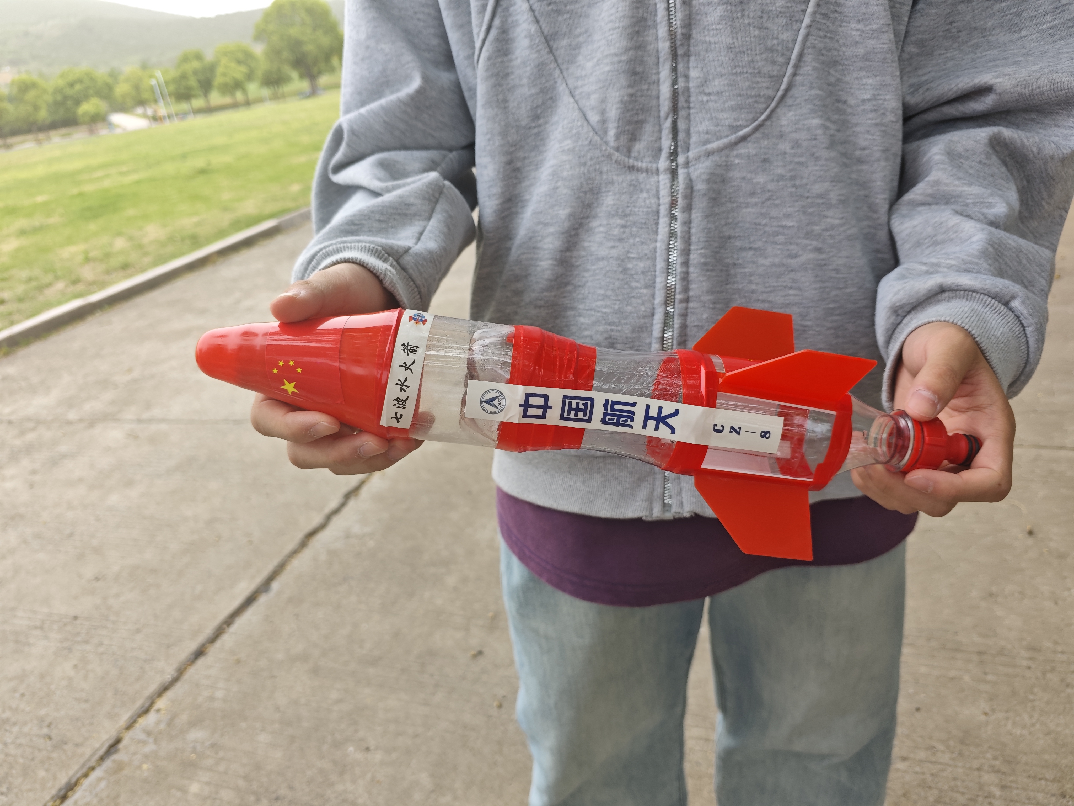 活动当日,同学们带好自己组装好的水火箭来到博学楼五楼的大草坪集合。安全员为参赛同学详细讲解了水火箭的发射原理、操作流程及安全注意事项,确保活动安全有序进行。负责测量成绩的同学在安全距离等待水火箭的降落。同学们都摩拳擦掌,期待水火箭能飞出好成绩。