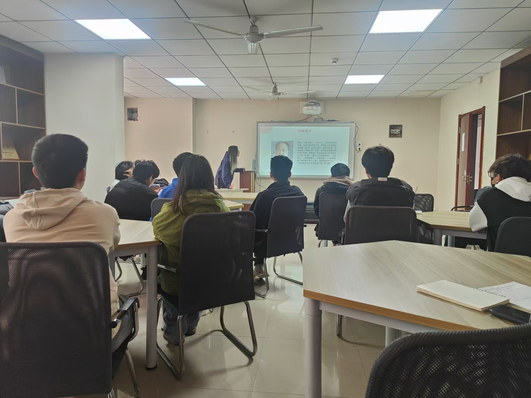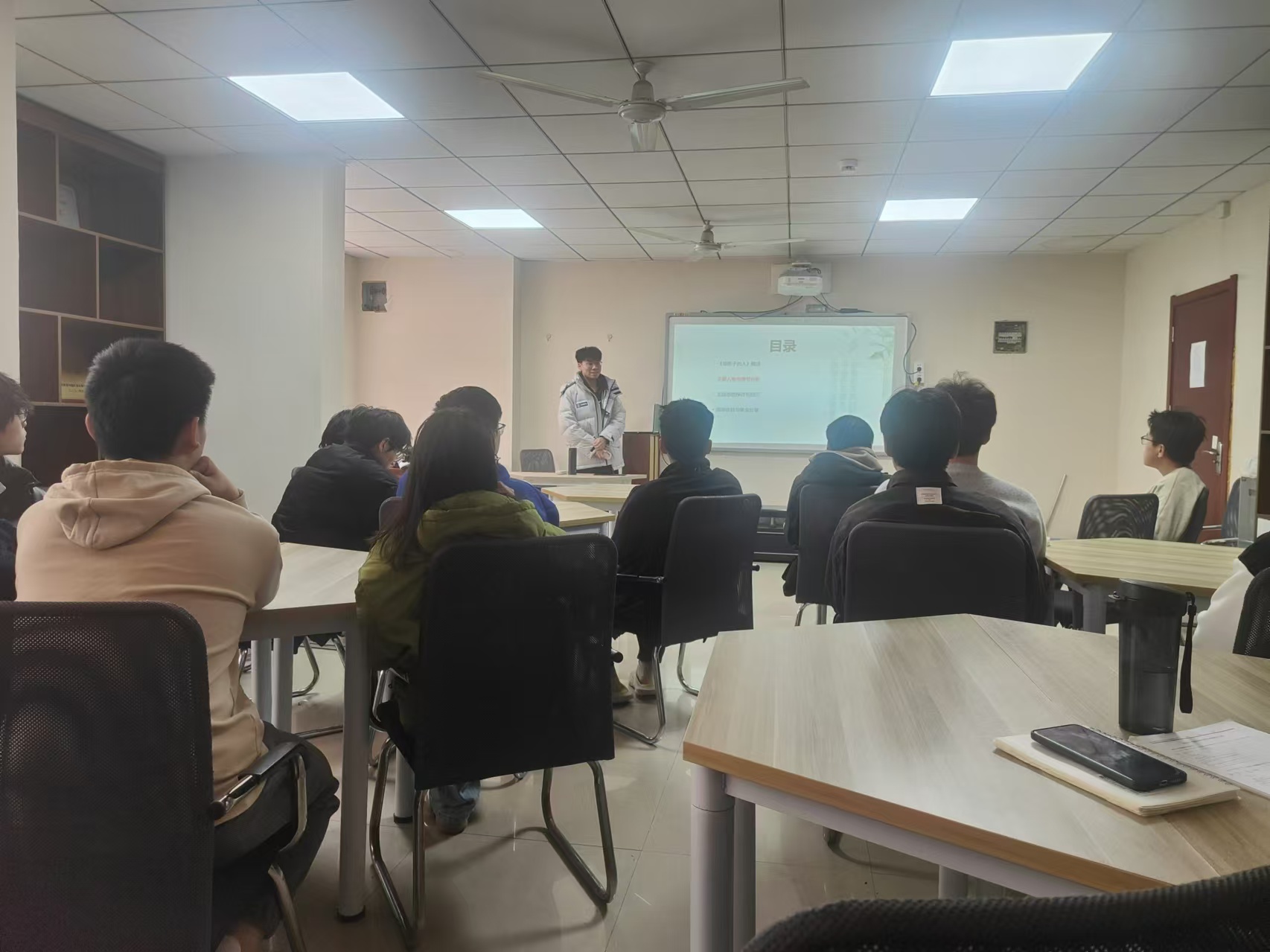 本次活动由周南男、黄若愚、李奇凯三位同学展开阅读分享。周南男同学分享的《酒国》采用多重叙事结构,融合魔幻现实主义等手法,体现了现实与幻想的交织,具有深刻的现实批判意义,她表示被作者莫言的批判精神所打动。黄若愚同学分享的《三体》是刘慈欣创作的长篇科幻小说,讲述了因叶文洁向三体文明发送信号,引发三体人入侵地球,人类奋起抵抗的故事,展现了人类与外星文明的博弈以及对道德、生存等问题的深刻思考。李奇凯同学分享的《偷影子的人》是马克·李维创作的一部温情疗愈小说,讲述了一个能偷别人影子并知晓其内心秘密的男孩的成长故事,通过男孩的经历展现了亲情、爱情和友情的美好与复杂,温暖且触动人心。