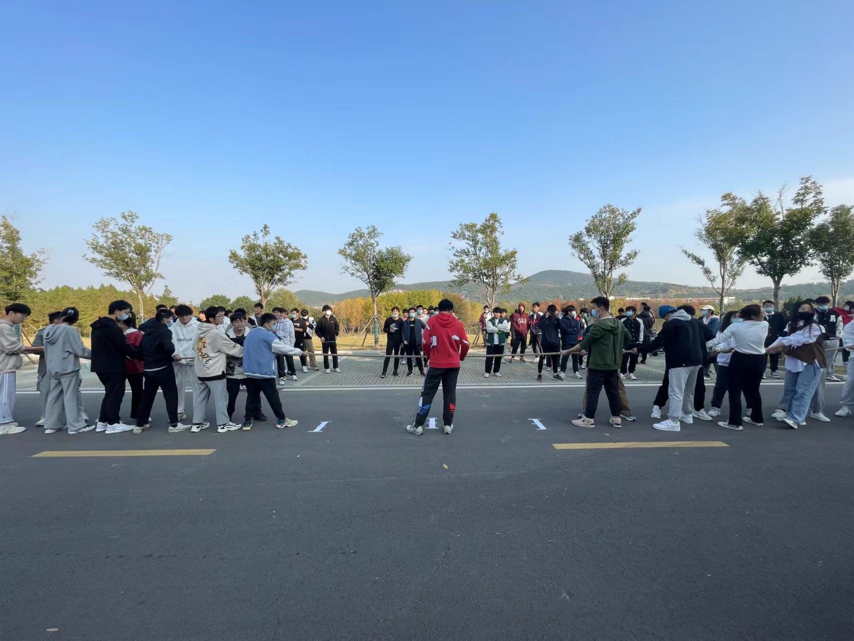 于力行楼东侧马路上举行2021级班级拔河比赛,辅导员刘世通、卢笛与2021级全体学生参加了此次活动。