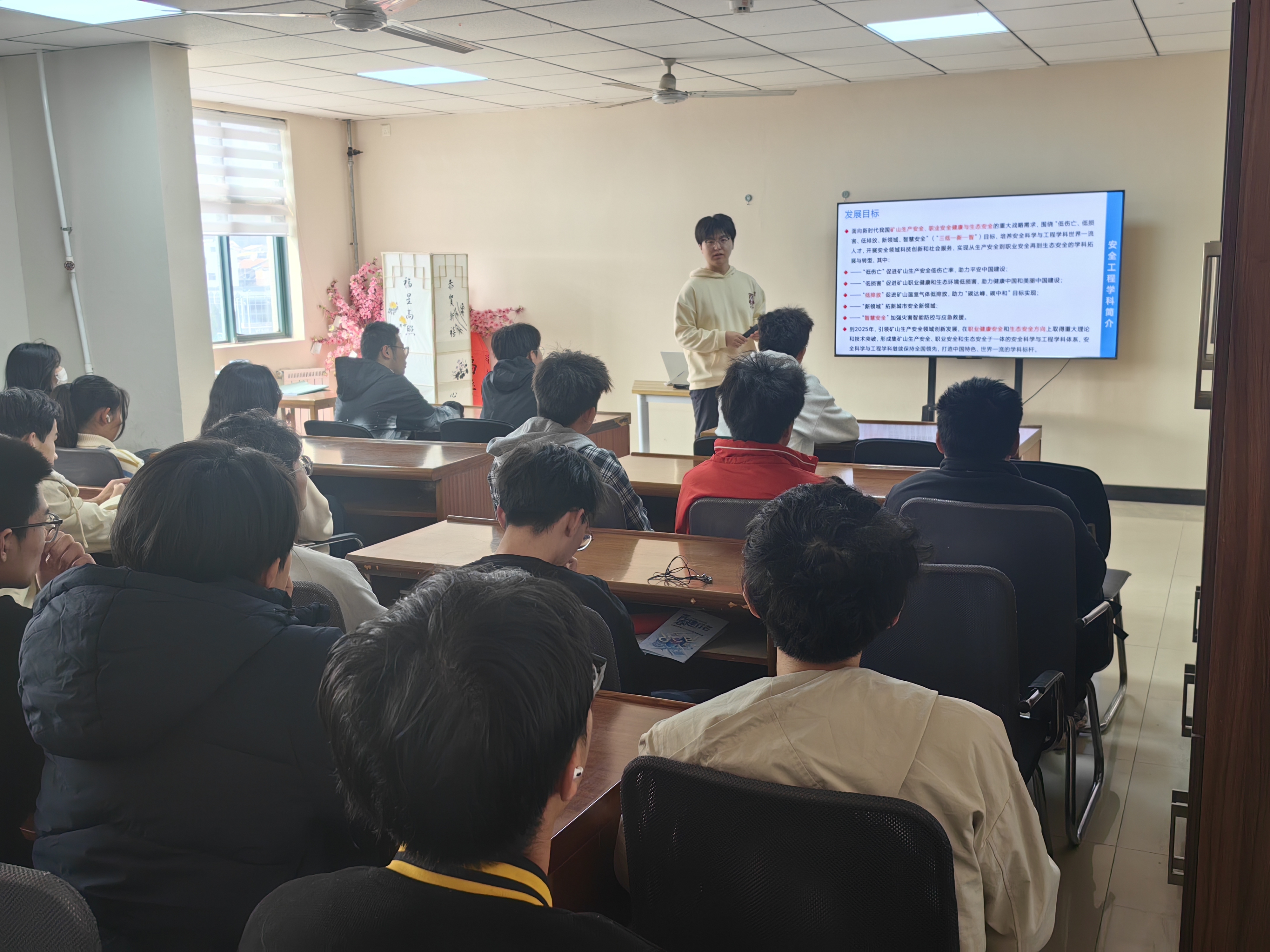 活动伊始,李孟阳介绍了安全科学与工程的分流方向、各专业的发展历程以及核心课程等。李孟阳清晰地解说帮助与会同学对各个分流方向有了初步的了解。接着,李孟阳详细讲述了专业分流后不同专业后续就业和升学情况。通过列举现阶段就业和升学案例,与会同学对于后续专业的选择有了初步的认知和判断。活动最后,李孟阳与同学们积极互动,回答他们的疑问,例如优才计划的具体内容等。