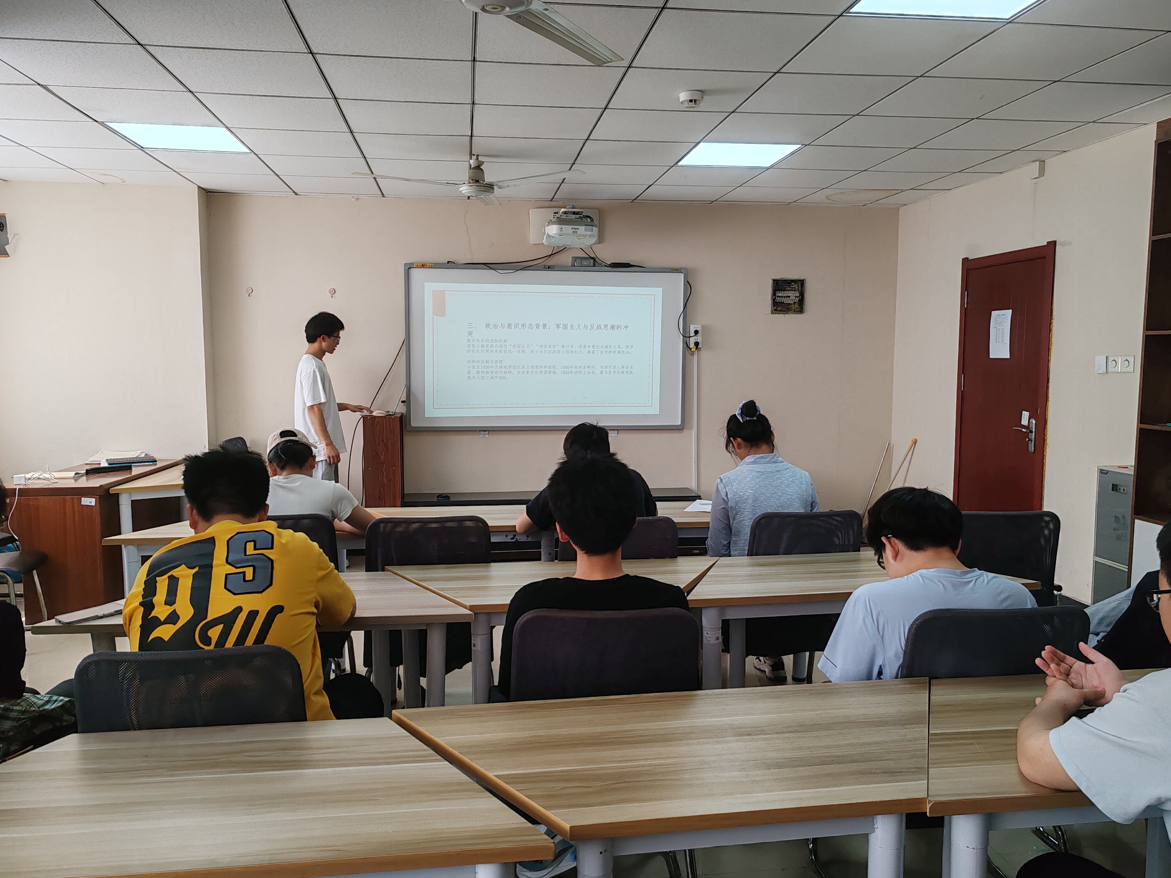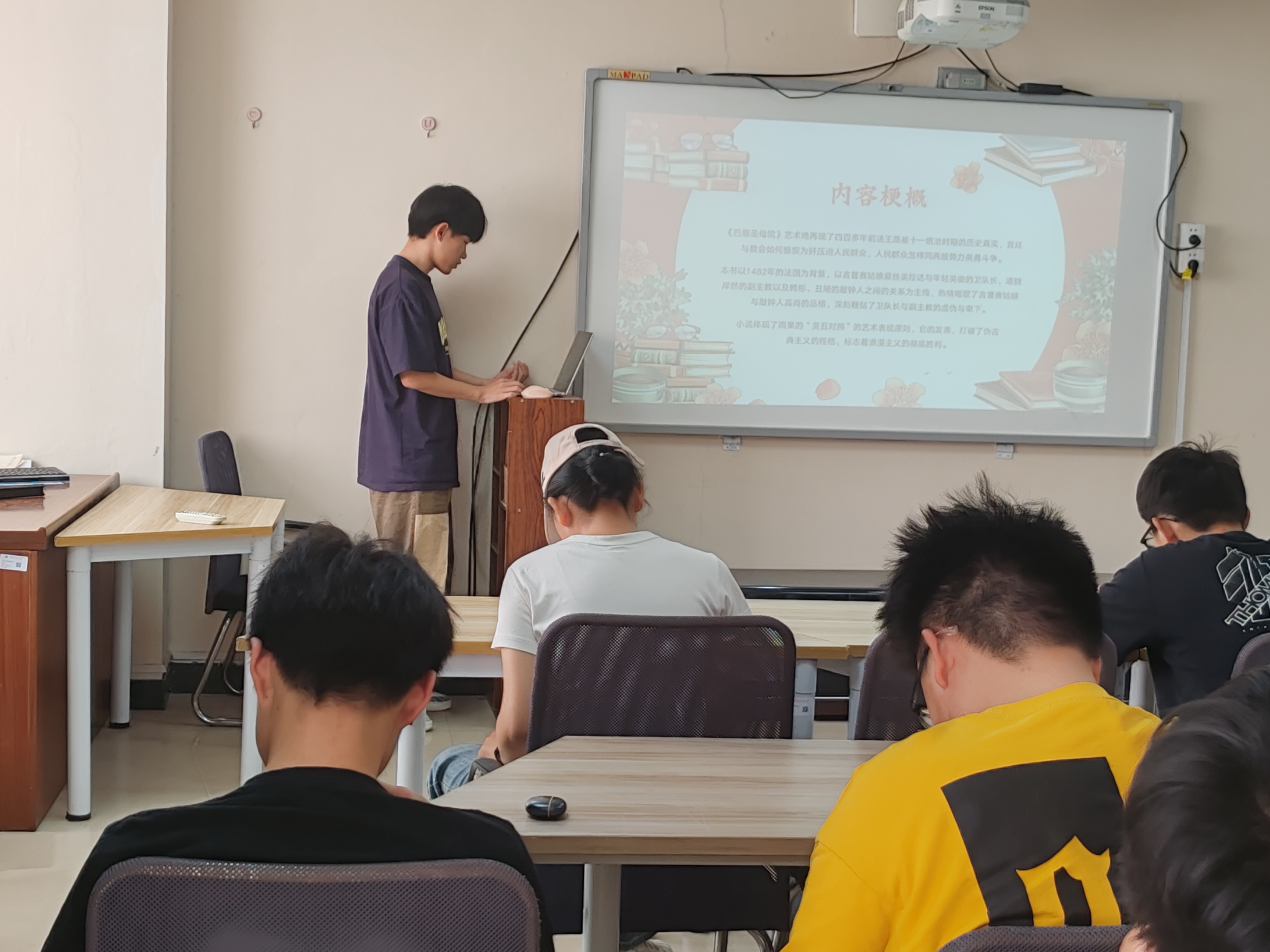 首先,马路博同学分享了《西线无战事》,这部作品是由德裔作家埃里希·玛利亚·雷马克所写的长篇小说,讲述了保罗·博伊默尔等青年受沙文主义煽动投身一战,在西线战场历经残酷战争,目睹伤亡与摧残,从满怀热情到对战争产生质疑,最终保罗阵亡的故事,小说深刻反思了战争的非人道性,呼吁和平。随后,杨升媛同学介绍了《第七天》,这本书以死者杨飞的视角,讲述他死后七日的所见所闻,涉及医疗事故、强行拆迁等社会现实,借温情的“死无葬身之地”对比残酷现实,展现社会荒诞,在荒诞叙事中蕴含对现实的批判与思考。最后,田晨昊同学分享的《巴黎圣母院》,以巴黎圣母院为背景,讲述了卡西莫多、爱斯梅拉达等人物的故事,丰富想象、怪诞情节与奇特结构相结合,展现了美与丑、善与恶的激烈冲突,同时反映了当时社会的种种问题,具有深刻的思想内涵和艺术价值。