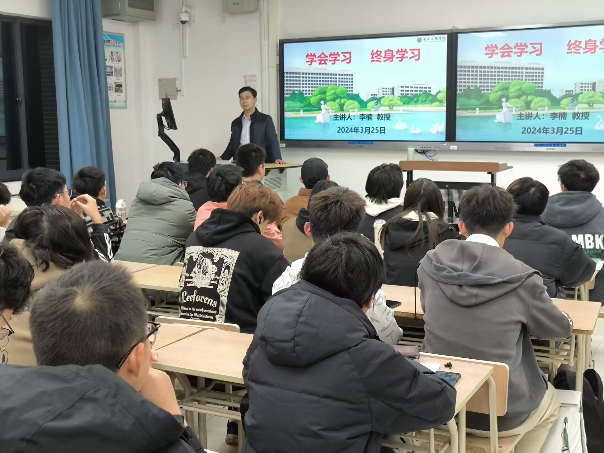 于博学楼五号楼A108开展“总结经验,探寻方向”主题讲座。李楠教授受邀主讲,2023级五班行政班主任周昆及全体同学参与讲座。