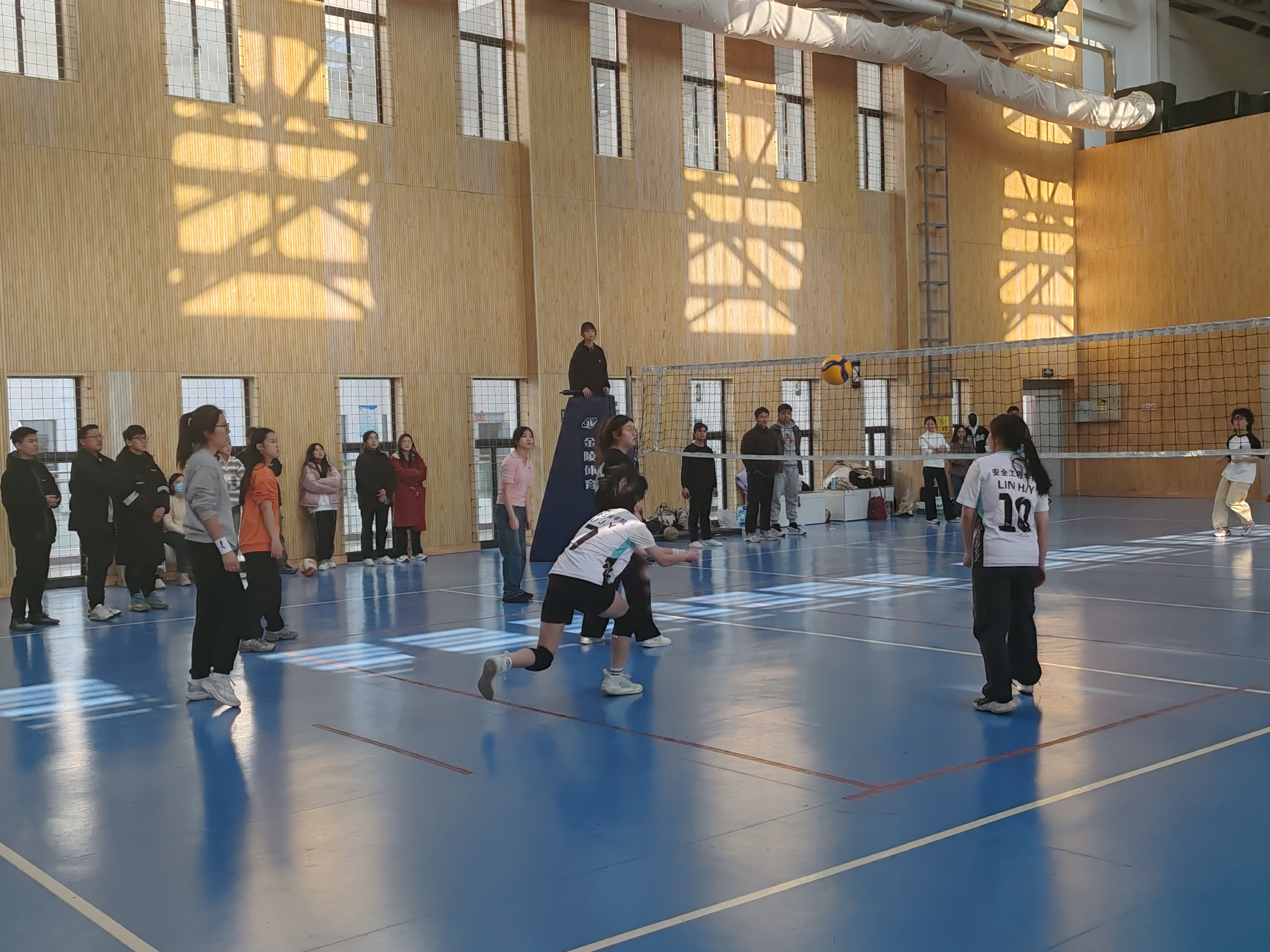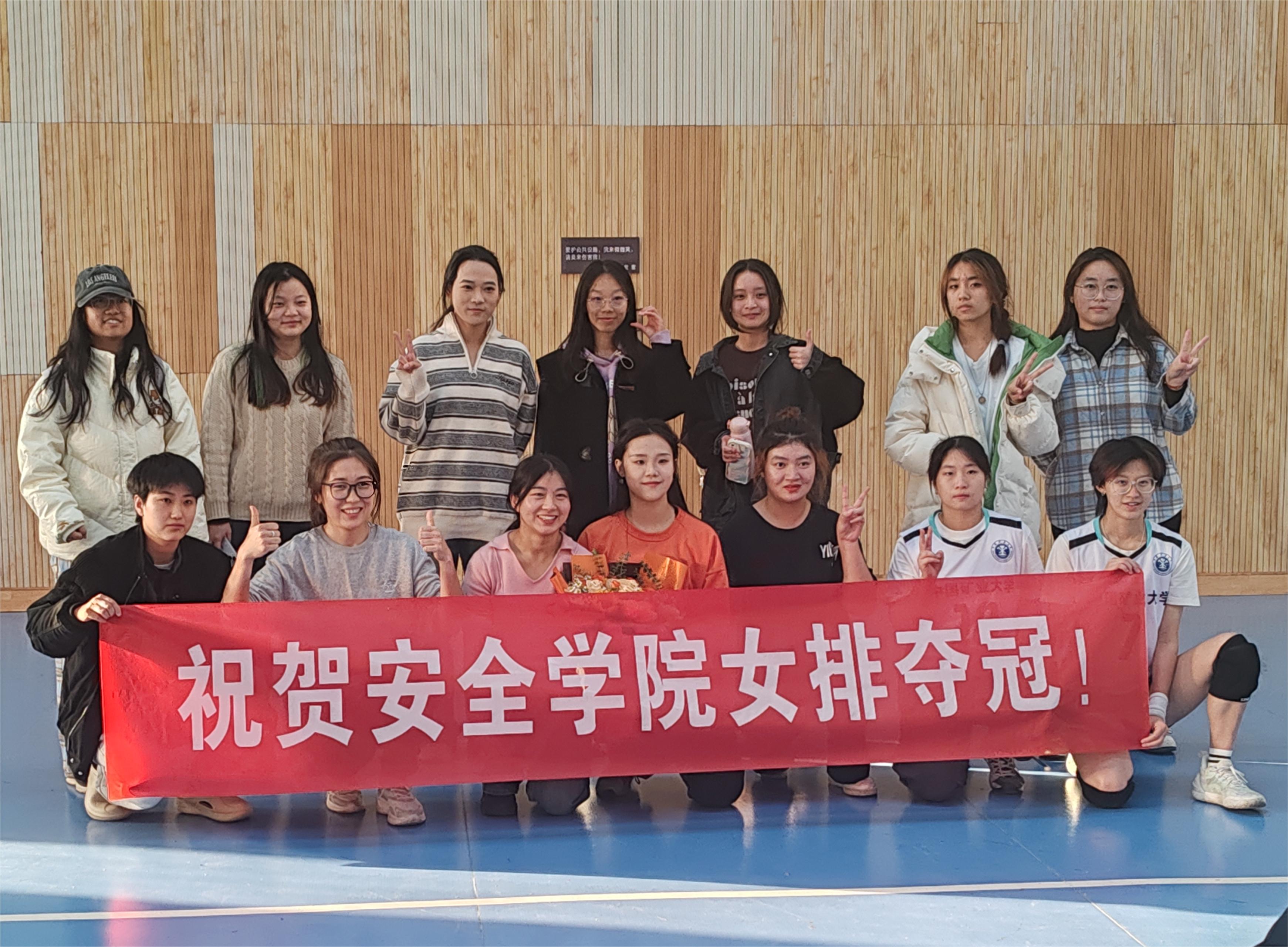 女排的精彩配合既展现了团队凝聚力,又发扬了运动健儿的拼搏奋斗精神,展现了安全学子的竞技风采。