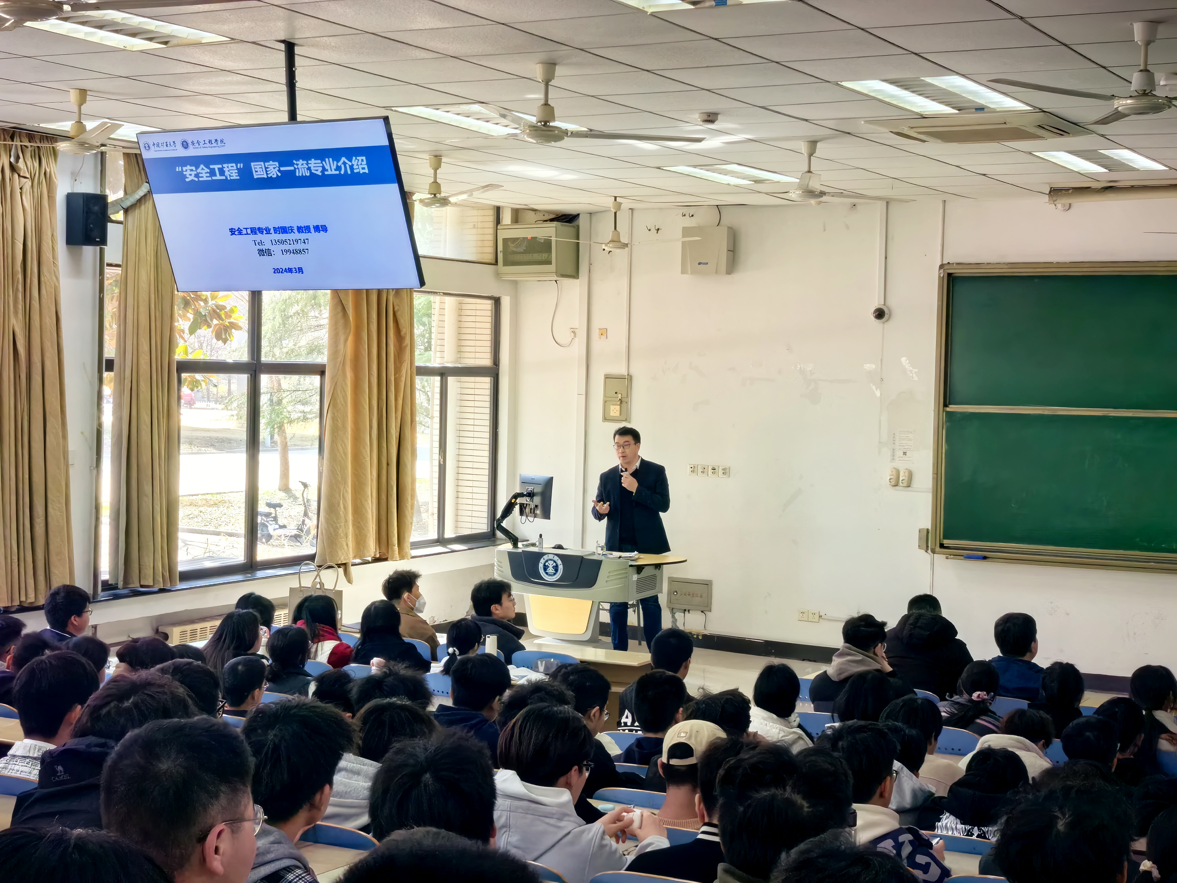 会议伊始,郭佳老师向在场同学介绍了四位主讲老师的基本情况,并向同学们强调了专业分流的重要性。首先,时国庆教授从安全工程专业的发展脉络、发展方向、专业培养目标、本校师资优势、专业课组方向和毕业生就业等不同方面向大家详细介绍了安全工程专业的优势和前景,细心地为大家讲授三个专业方向的区别,并鼓励同学们在专业选择上认真思考,选择符合自己兴趣、特点的满意专业,不要随波逐流。接着,刘洪永副教授以幽默诙谐的语言从四个方面向大家解读消防工程专业,期间他通过现场照片、动画展示等形式向大家介绍消防行业的业务构成,并结合国内外案例消除大家对消防工程专业存在的误区,还用往年毕业生情况梳理了消防工程专业的发展趋势、就业前景。随后,杨永良教授以“医工结合”为题向大家介绍职业卫生工程专业,他以国际职业健康现状为切入点,引出职业卫生人才短缺的现实,结合国家政策导向,解读职业健康的内涵,并用图表和数据等形式介绍了该专业的培养体系和发展方向。最后,安伟光教授从专业背景、前期基础、师资队伍、人才培养方案、专业发展规划等方面,向在场同学详细介绍了应急管理技术专业,并以图形对比的形式讲清该专业的具体内容。活动结束后,四位教授积极解答学生疑问,并就国际班选拔、优才培育计划等问题进行引导。