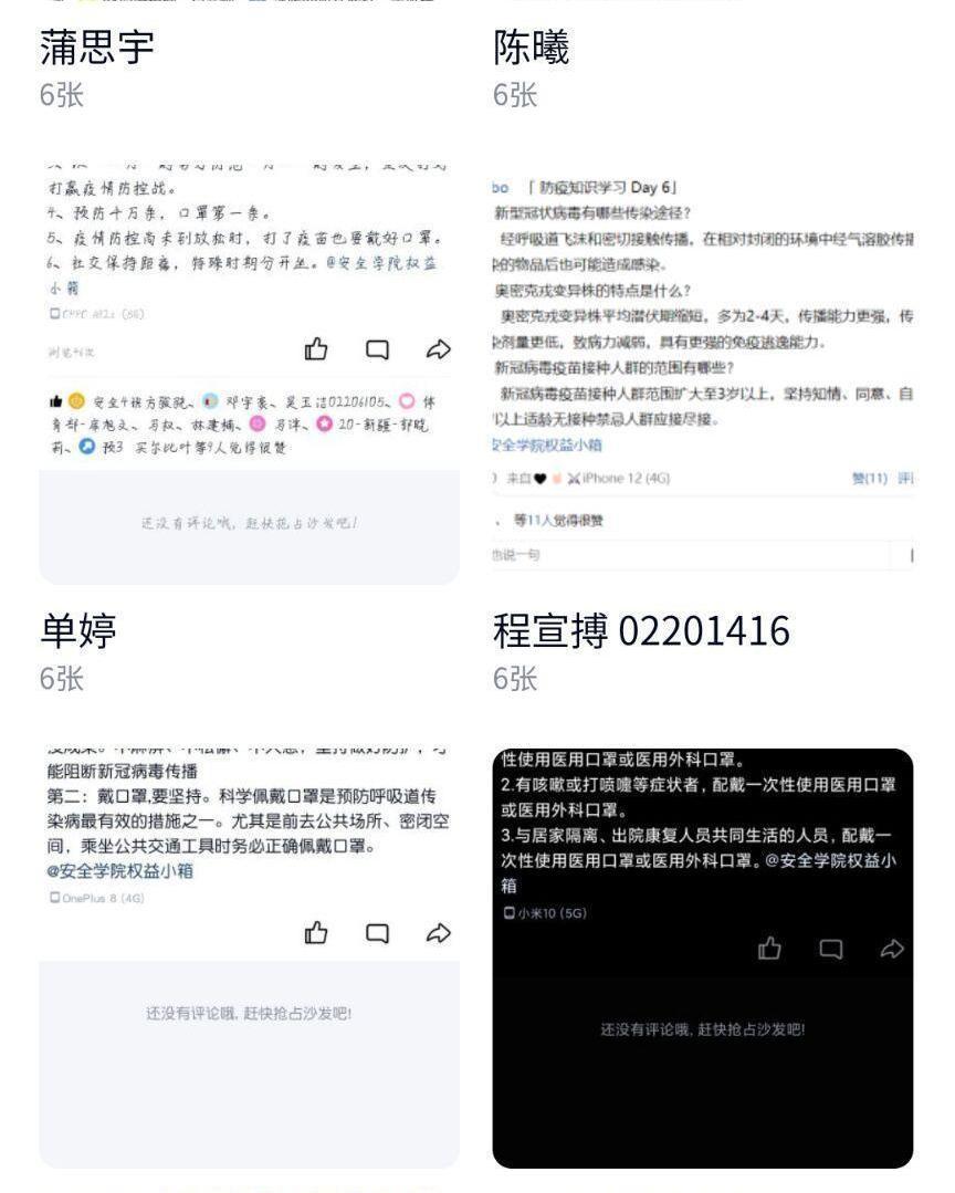 同学积极报名踊跃参加,不仅拓宽了自身的防疫知识,也号召了更多人加入到防疫知识科普的行列中。参与同学以热情饱满的态度为防疫工作奉献自己的青春力量,展现了安全学院高度服从、积极抗疫的决心。