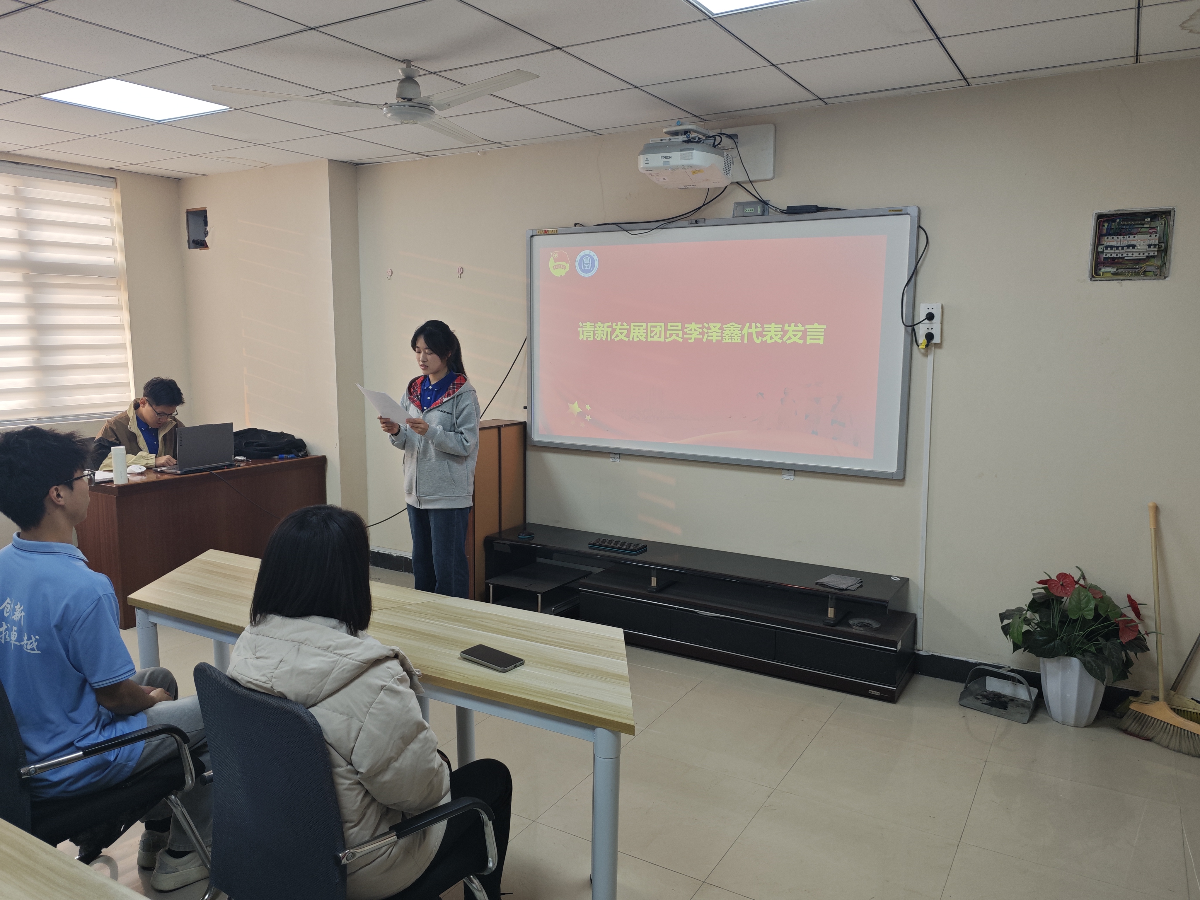 仪式伊始,主持人详细报告了入团仪式相关情况,并宣读新团员名单。紧接着,郭佳老师为新团员颁发了团员证与团徽。随后,团员代表邓超带领新团员庄严宣誓,新团员们目光坚定,誓言铮铮,表达了对共青团组织的无限忠诚和为团组织增光添彩的决心。宣誓完毕后,新发展团员代表李泽鑫上台发言,他表达了加入共青团的自豪与喜悦,并承诺将以更高标准要求自己。紧接着,老团员代表董泊江分享了自己的入团经历与成长感悟,鼓励新团员传承和发扬共青团的优良传统。学生代表发言完毕后,学院团委书记郭佳老师上台,对新团员提出希望与要求。她希望新团员们不断提升自己,在学习与生活中发挥模范带头作用,始终胸怀一颗爱国心,努力成长为有理想、敢担当、能吃苦、肯奋斗的新时代好青年。