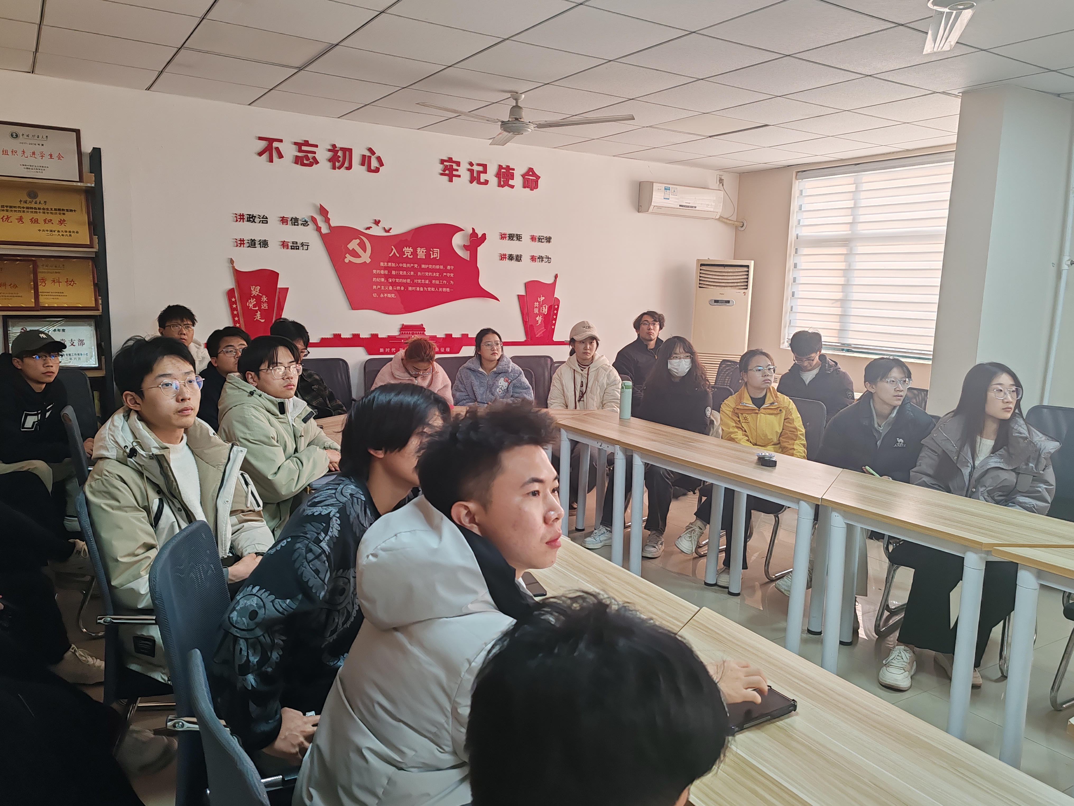 学生党员工作站于力行轩开展主题为“就业经验分享”的青春面对面活动,胡方余同学担任主持人,郭勇鲲、王相胜受邀主讲,本科生第一、二党支部成员积极参与。