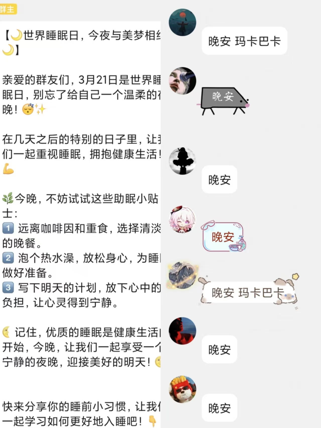 活动以“晚安能量站”为核心主题,于3月15日至3月21日进行,同学们通过QQ群匿名的方式互道晚安、好梦等祝福,营造了温暖互助的线上社区氛围,有助于养成早睡的习惯。同时,心理自助中心定期向群内推送睡眠相关的健康知识,帮助同学们深入理解规律作息的重要性,将健康理念融入日常点滴。