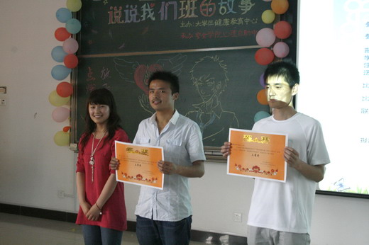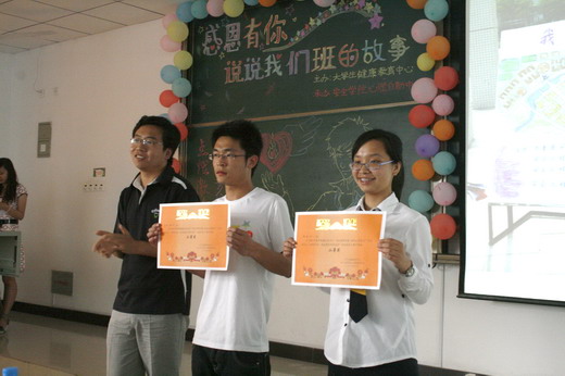 心理健康自助中心指导教师李秀老师对本次比赛进行精彩的点评并对“感恩有你”活动主题进行深刻的诠释:“感恩有你”的“你”既是我们每个人自己,又是身边的朋友、同学,更是班级这个大家庭,正是因为这些,我们的生活才如此的丰富多彩。最后,主持人当场公布了比赛成绩并由评委颁奖。地质09-1班荣获一等奖,消防09-1班与英语09-6班获二等奖,安全09-1班与科技09-1班获三等奖,数学08-3班、过控09-2班、交运09-2班、建筑08-1班、工商09-1班获得鼓励奖,比赛就此圆满结束。通过本次班级风采大赛不仅调动了各参赛班级的创造积极性,而且在提高班级凝聚力的同时,展现了班级积极向上的风貌,为塑造一个健康向上、感恩有爱的校园提供了美好的机会。