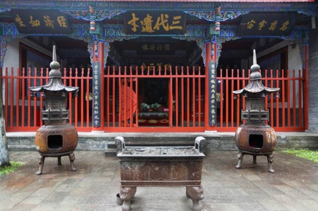 下午三点,团队成员抵达武侯墓。诸葛亮墓周围有定军山、少祖山下沿的九条小山岗环抱,九条山岗由八条小溪分割而成。墓前上岗三层,自定军山向西叠浪而来,约三里许至此成眠弓形,古称“三台书案”。从少祖山下六岗向东势若游龙,倏起忽落五六里,至墓后形成新月者半里许,传为墓之正脉。新月之下,眠弓之内,豁然开张平地三百余亩,左右前后九支环抱。进入大殿院中,有许多历代歌颂诸葛亮的诗词和复修墓庙记文的石碑。大殿龛上,端坐着诸葛亮的塑像,纶巾,羽扇,鹤氅,方据,神态庄严。关兴、张苞,侍立左右。 墓在大殿之后,南北向,头北脚南,取北顾中原、南立蜀国之意。