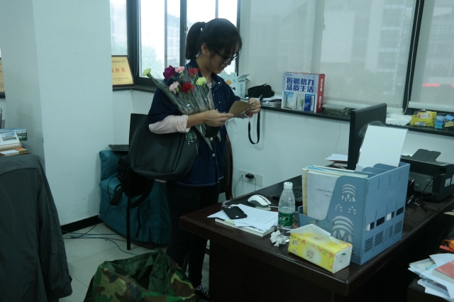 下午3点,主席团先确定了鲜花、贺卡、水杯礼物后后在学校精心挑选教师节礼物并手写贺卡为老师祝福。之后来到矿科A 300为老师送去教师节礼物。但由于老师去检查寝室卫生的缘故,矿科A300老师都不在。为不打扰老师们的工作,主席团们便把义务贺卡整齐的摆放在对应的老师办公桌上,并且给每一个老师电话祝福:祝福节日快乐。老师们对于主席团送礼物的行为也感到非常欣慰:“今天我们很开心,桃李不言,下自成蹊,作为老师,是我们的荣幸,也是我们的光荣。”