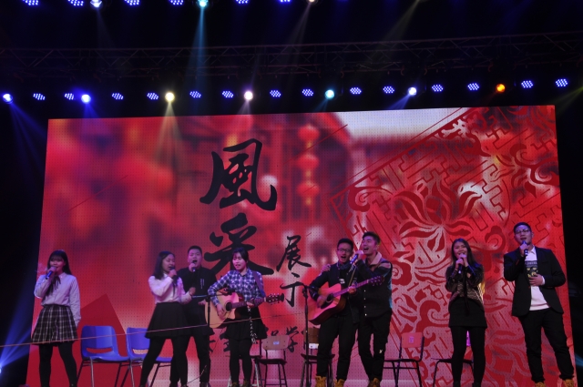 七点整,晚会开始。晴天艺术团带来的舞蹈茉莉花开一开始就给观众带来一场绝美的视觉享受。接着,校领导为年度获奖学生和团体颁奖,肯定了他们在2016年付出的努力,并以此鼓励他们再接再厉,在新的一年中再谱人生华章。随后,总务部演奏了一段独特的锅碗瓢盆交响曲,随后各个学院的表演开始。安全学院的代表自弹自唱,为全场献上一曲《年轻的模样》串烧民谣,歌唱出青春的悲与欢,唱进人们心中,全场掌声雷动。表演结束后,安全学院的主席团登台向全校师生送出新年祝福,并献上一副对联以迎接新年。安全学院结合学院特色创作对联,不仅表达了对大家新年平安喜乐的祝福,而且显示了学院专业的独特魅力。