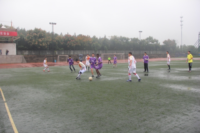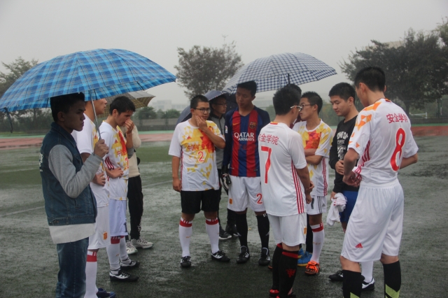 12时30分,天空中下着滂沱大雨,整片球场早已一片积水,面对如此恶劣的天气,安全学院队员没有丝毫抱怨,积极参赛。随着主裁一声哨响,比赛正式打响。一上场,安全学院的队员们积极地跑动、传球、逼抢,前锋果断出击,直接打门,打出几次高质量的射门。上半场,安全学院稍稍落后,中场休息时安全学院足球队长调整战术,队员之间也相互打气鼓励。下半场,一开始安全学院就加强攻势,经过几番精彩配合,一名前锋大力抽射,球直达死角,落入网窝。在总结经验后,安全学院打得更加主动,最后虽不敌国际学院,但虽败犹荣。