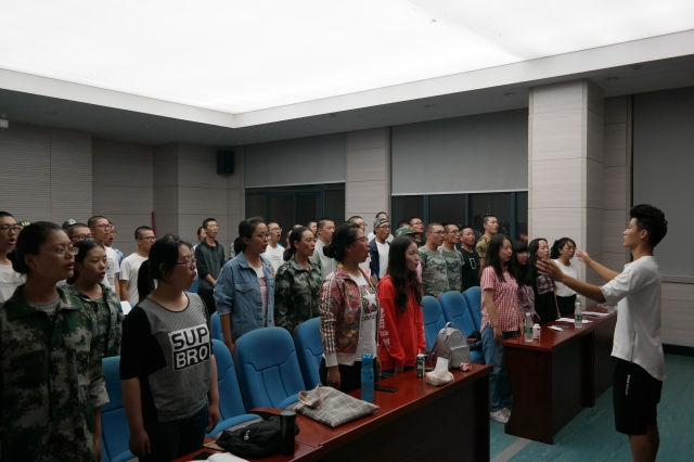 6点30分整,参与此次红歌大合唱的新生们准时到达地点。在唱歌之前,教练要求新生们进行发音练习。在她的指导下,每一个新生都张大了嘴巴,全身心的投入到了训练之中。为了提高训练效率,教练教给了新生一个小诀窍:每个新生都从座位上站了起来,跟着教练的动作,一边挥舞胳膊,一边发出凝聚而短促的声音,洪亮的声音萦绕在会议室中。在发音训练结束后,教练让同学们相互捶背进行放松,同学们互相照应,这也促进了整个团体的凝聚力。之后又进行了多遍演唱练习,每次演唱后,教练都会指出其中问题所在,并要求同学们在下次演唱中改正,并时常提醒同学们应当注意的问题。红歌激昂,新生们的热情也十分高涨,一个个都积极配合,态度认真。两个小时后,同学们就顺利完成了今天的排练任务。