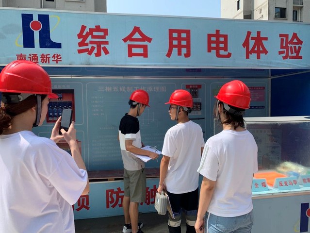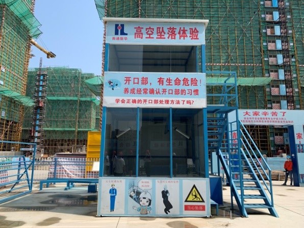 施工场地的安全风险体验馆由高空坠落体验区,爬梯对比体验区,钢丝绳使用演示区,灭火器演示体验区,安全带使用体验区,平衡体验区,墙体坍塌体验区等若干体验区组成。实践团成员们在南通新华建筑集团的安全保障员苏工的带领下进入施工现场,他首先向成员们介绍了工地上合格的钢丝绳的结法,工地电缆的内部组成和不同灭火器的使用方法。接着他带领成员们来到位于体验区左侧的高空坠落体验区,高空坠落体验区由两层板房构成,在第一层有保护软垫,第二层楼层的地面由可开合的板块构成,“维安”小组一行人先是体验了一次没有任何保护措施的坠落体验,然后苏工亲自为成员们解释并示范了正确的坠落时的保护姿势,成员们收获良多。