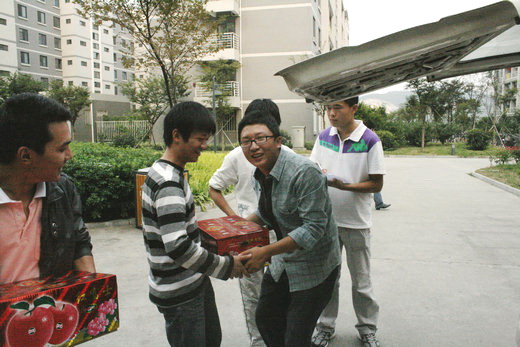 9月29日下午四点半,PO18 学生会部分学生会干部在梅三楼下向全院各班发放由学院办公室统一采购的整箱新鲜的“红富士”苹果。各班班长、团支书带领本班同学陆续前来领取。学生会学生干部热情地将每一箱苹果送给各班,并通过班干向各班同学表示良好的节日祝福。