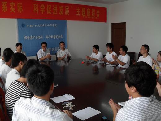 李庆钊博士出席座谈会,并组织安全08-4班学生积极参加。据悉,该党员实践团于前一日到达张双楼煤矿,积极联系张双楼矿相关党支部,旨在通过双方的交流,促进对“创先争优”活动的认识,进一步引导广大党员同志高境界解放思想,高标准提升素质增强能力。