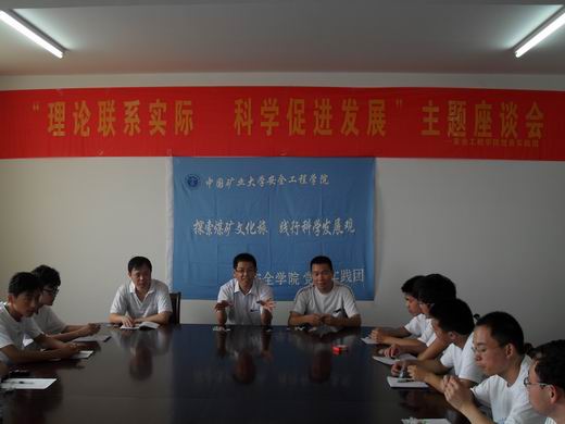 “探索煤矿文化旅・践行科学发展观”党员实践团主办的“理论联系实际科学促进发展”主题座谈会在张双楼职工学校第一教室隆重举行。