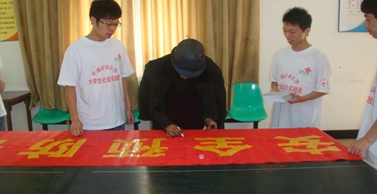 在矿区领导的大力支持下,上午九时许,燎原煤矿员工活动室展开了签名活动。团队成员与矿工热心交谈,向他们宣讲了发生险情前的征兆以及遇到险情时的自救和求救的办法,对高瓦斯矿的认识和灾害防治办法,发生险情之后的求生办法等,并向他们发放了自制的安全手册。由于手册以漫画的方式阐释灾害防治以及求生方法,不少矿工看完后开怀大笑。一名年纪稍长的矿工说:“你们这些学生就是有办法,连我这不识几个字的都能看懂。”不少矿工在签完名后仍不愿离去,与团队成员讨论起安全手册中宣讲的内容。
